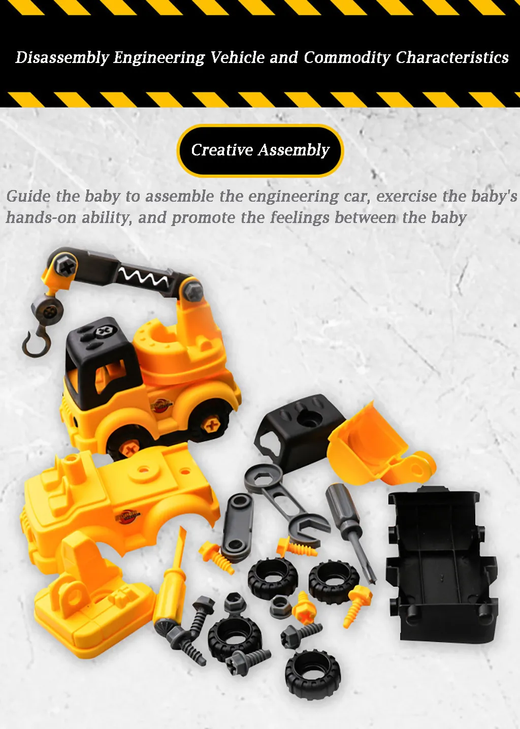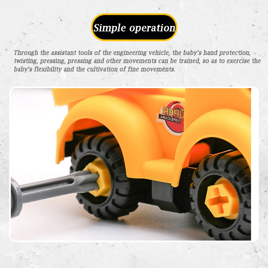 1. Руководство грузовик для сборки ребенка Тренировать ручные способности ребенка и поддерживать отношения между Малыша. 2. Через демонтаж или Собирая автомобиль, можно упражнять мышление малыша и ручные навыки. 3. С небольшим нажатием и без Если вам нужны батареи, инженерное транспортное средство будет работать на расстоянии. 4. Яркий цвет и дизайн С закругленными краями, очень привлекательный для детей. 5. Высокая имитация реального автомобиля, Который доставит Вам большое удовольствие во время игры.Параметры: