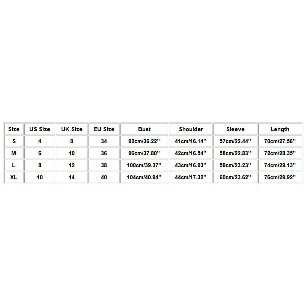 Пожалуйста, сравните детальные размеры с вашими перед покупкой!Цвета могут немного отличаться в зависимости от настроек компьютера и монитораПожалуйста, учитывайте разницу в 1-3 см из-за ручного измерения, спасибо (все измерения в см и обратите внимание, что 1 см = 0,39 дюйма)Таблица размеров: РазмерАмериканский размерРазмер ВеликобританииЕвропейский размерБюстПлечоРукавДлинаS483492 см/36,22''41 см/16,14''57 см/22,44''70 см/27,56''М6103696 см/37,80''42 см/16,54''58 см/22,83''72 см/28,35''L81238100 см/39,37''43 см/16,93''59 см/23,23''74 см/29,13''XL101440104 см/40,94''44 см/17,32''60 см/23,62''76 см/29,92''