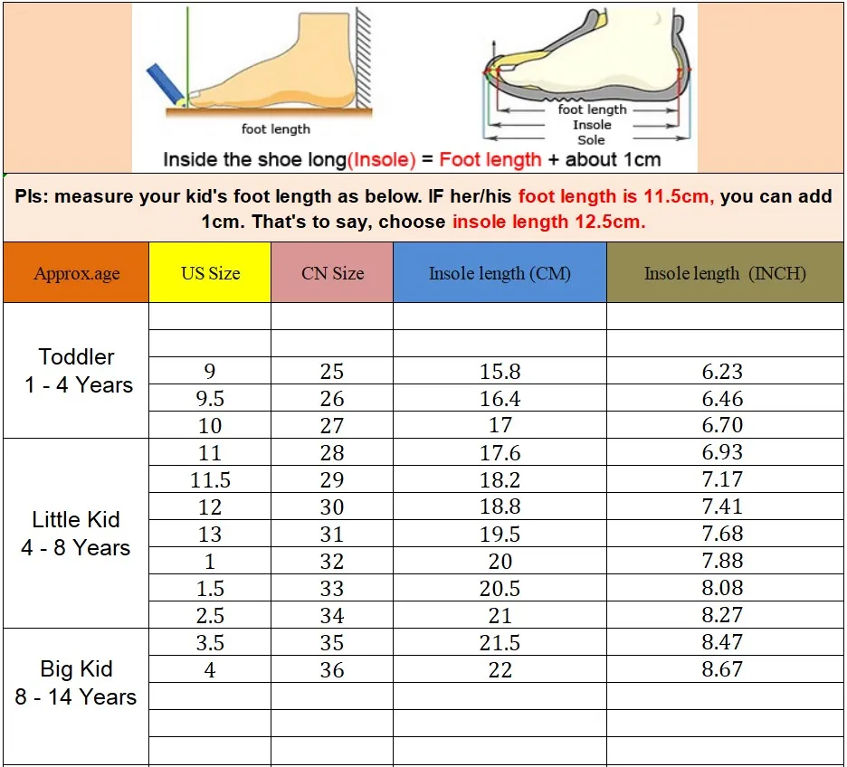 2. Что касается размера, Измерьте длину стопы ребенка в см или дюймах + 1 см или 0,03937 дюймаChВыберите соответствующий американский размер, спасибо.