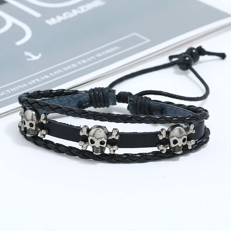 Poisonous Sign Skull Charm Leather Bracelet Set Multiplayer Black Leather Braided Bracelet Bangle Men Wristband Jewelry 6pcs/set