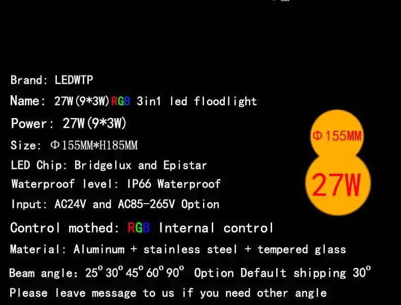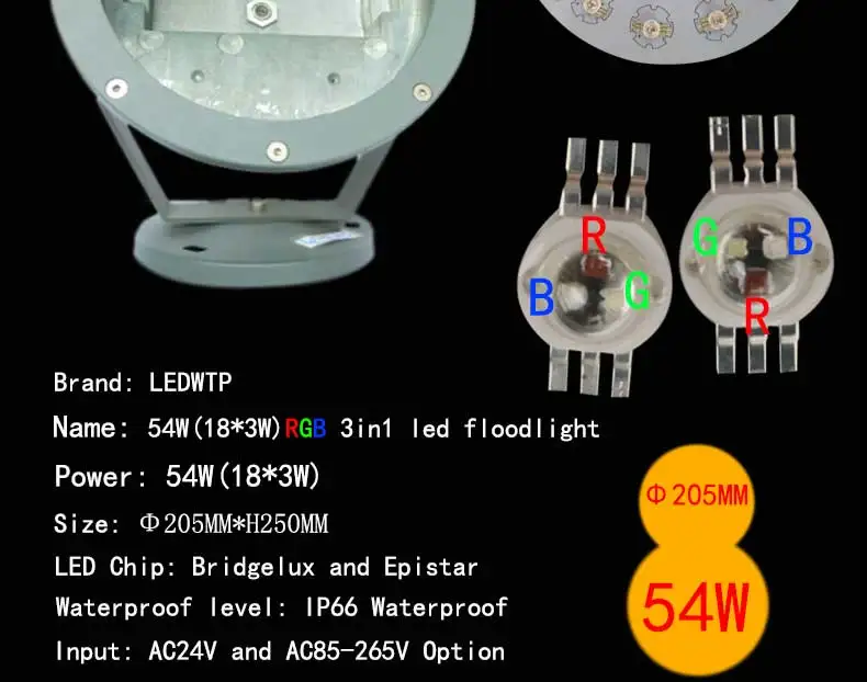 Теплые советы: лампы являются Внутренним контролем, Входная мощность переменного тока в режим автоматического преобразования (не нужен контроллер). Лампа должна включать питание переменного тока лампы могут быть синхронизированы, лампы не могут синхронизироваться, если вы входите питание постоянного тока Название продукта: 3в1 RGB внутренний контроль светодиодная подземная лампа Выходная мощность: 18 Вт (6*3 Вт), 27 Вт (9*3 Вт), 36 Вт (12*3 Вт), 54 Вт (18*3 Вт) Напряжение: AC24V AC85-265V, 50-60 Гц; Светильник: Bridgelux и Epistar Цвет излучения: RGB (3в1) Светодиодный режим работы:-45 °C ~ 75 °C Срок службы:> 80000 часов Гарантия: 3 года Сертификация: CE и RoHS Особенности: Энергосберегающий на 45-70%, чем традиционный светильник, и длительный срок службы:> 50000 ч. Защита окружающей среды, отсутствие ртути, свинца, УФ-и термического излучения, защита глаз. Импортный светодиодный чип высокой яркости, алюминиевый корпус, отличный тепловой дизайн. Посылка включает в себя: 10 шт. 3в1 RGB Светодиодный проекционный светильник