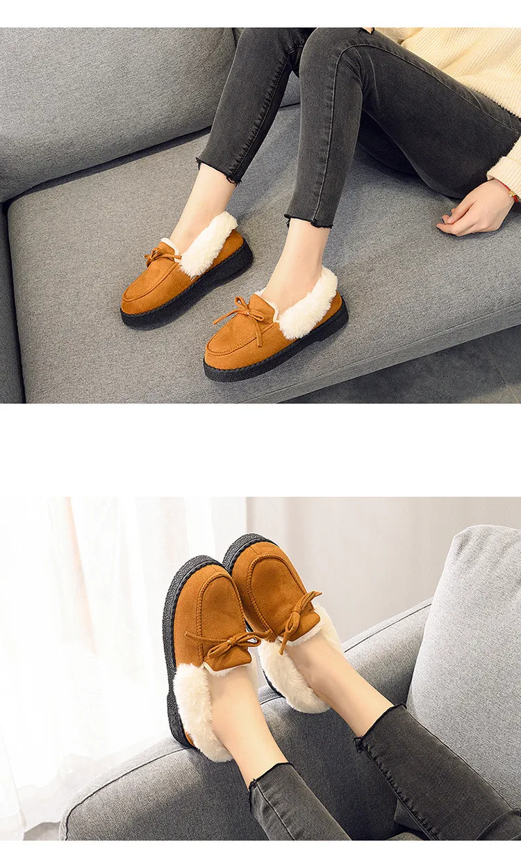 Зимняя женская обувь; Лоферы на плоской подошве; Женская повседневная обувь на меху без шнуровки; Модные женские плюшевые теплые зимние ботинки на платформе с бантом