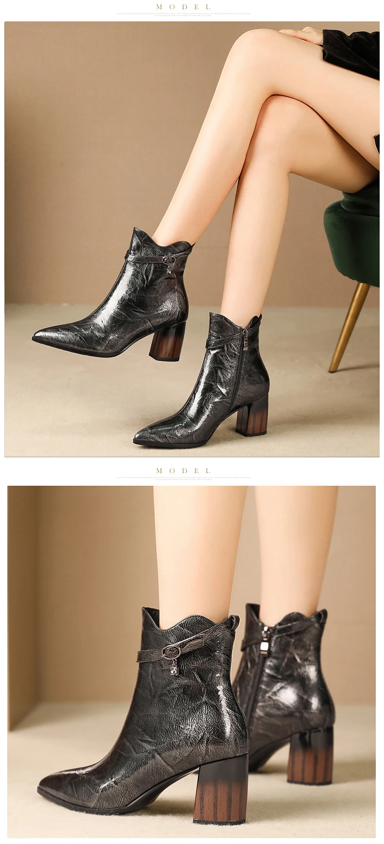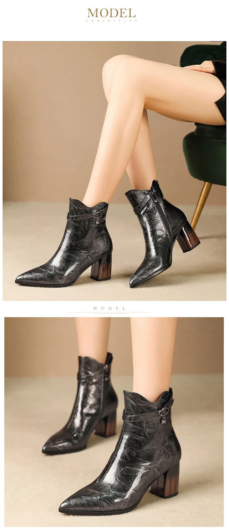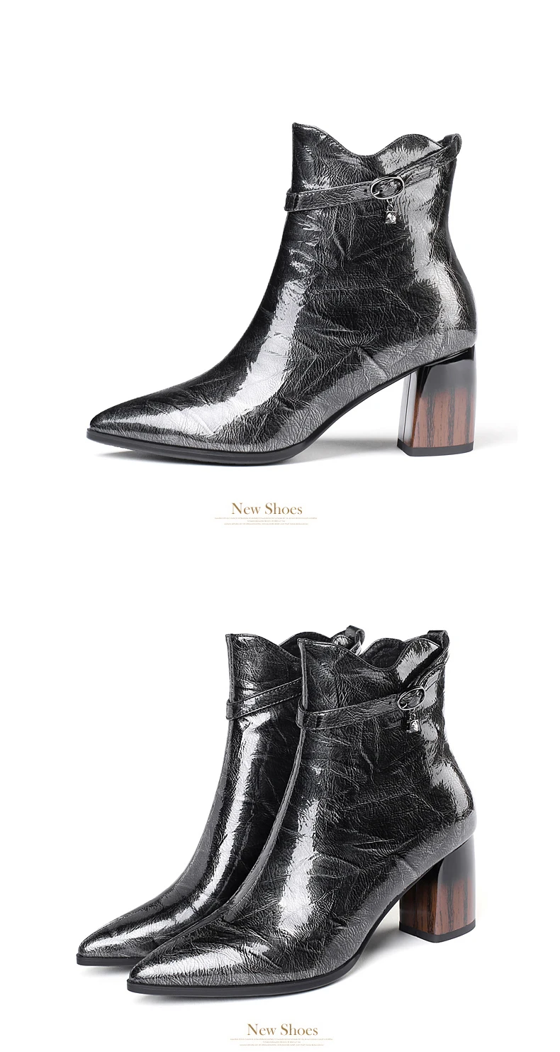 Год выпуска: осень 2019 Типы цветов: черный Размер: 34-42 Материал верха: лакированная кожа Внутренний материал: свиная кожа/бархат Высота каблука 6,0 см Окружность трубы: 24 см Высота голенища: 13 см Примечание: указанные выше данные измеряются по стандарту 36 размера (1,5).