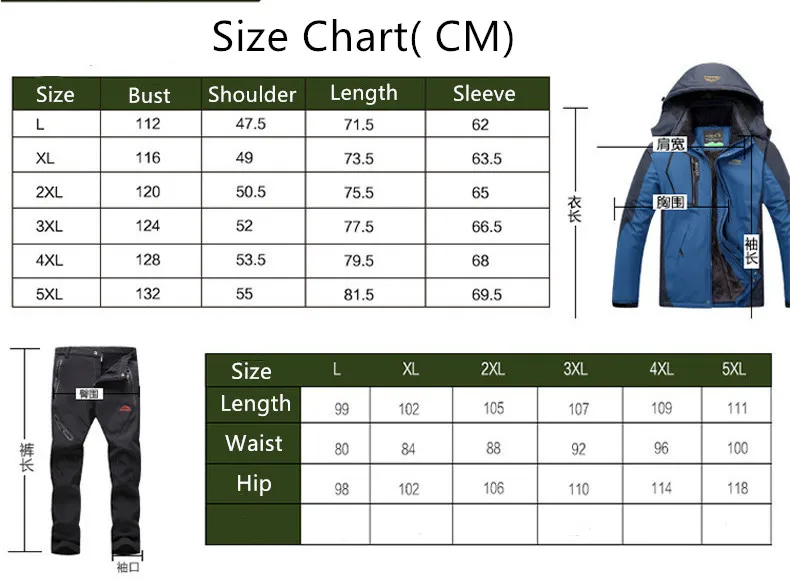 Для курток: Пожалуйста, выбирайте размер на основе веса и роста, основываясь на нашей таблице размеров Для брюк: Пожалуйста, выберите размер на основе талии. Таблица размеров (см)