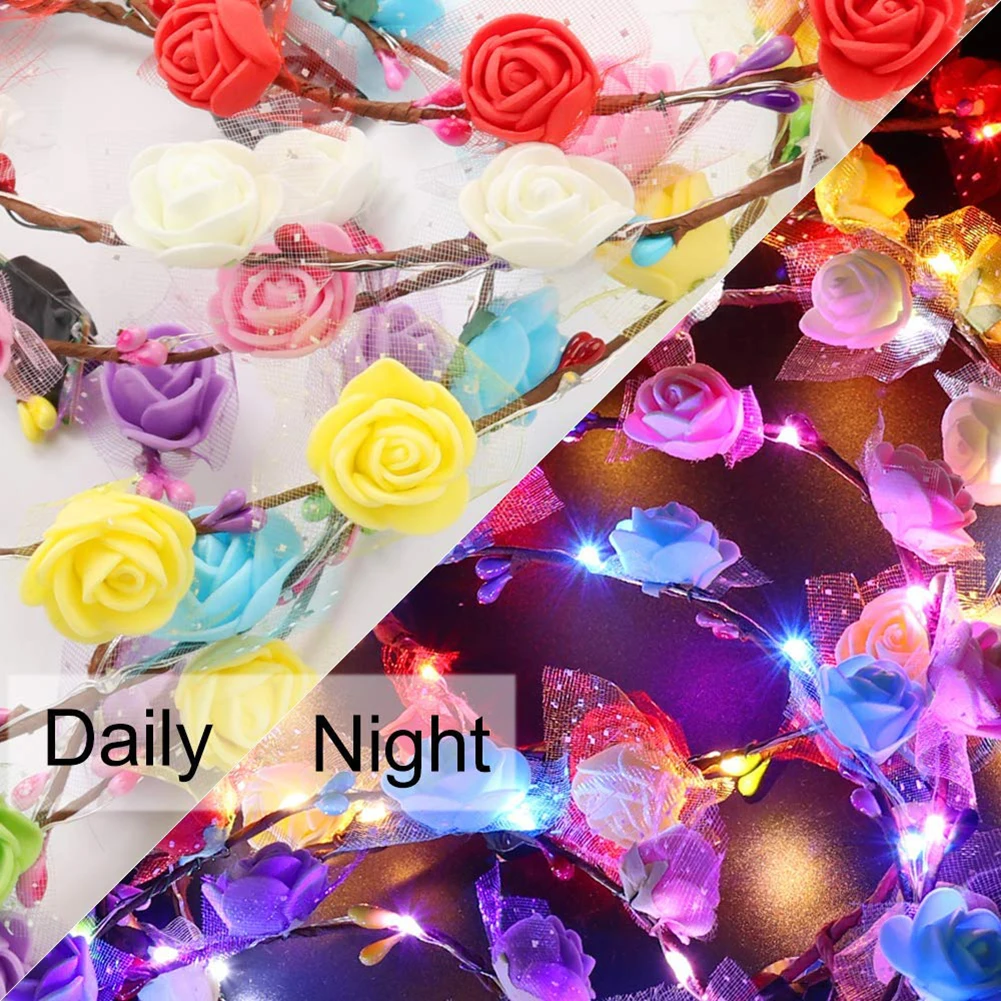 -Корона с цветами может светильник в темноте или на закате. Есть 7 цветов венков: синий, желтый, розовый, красный, белый, фиолетовый и многоцветный.