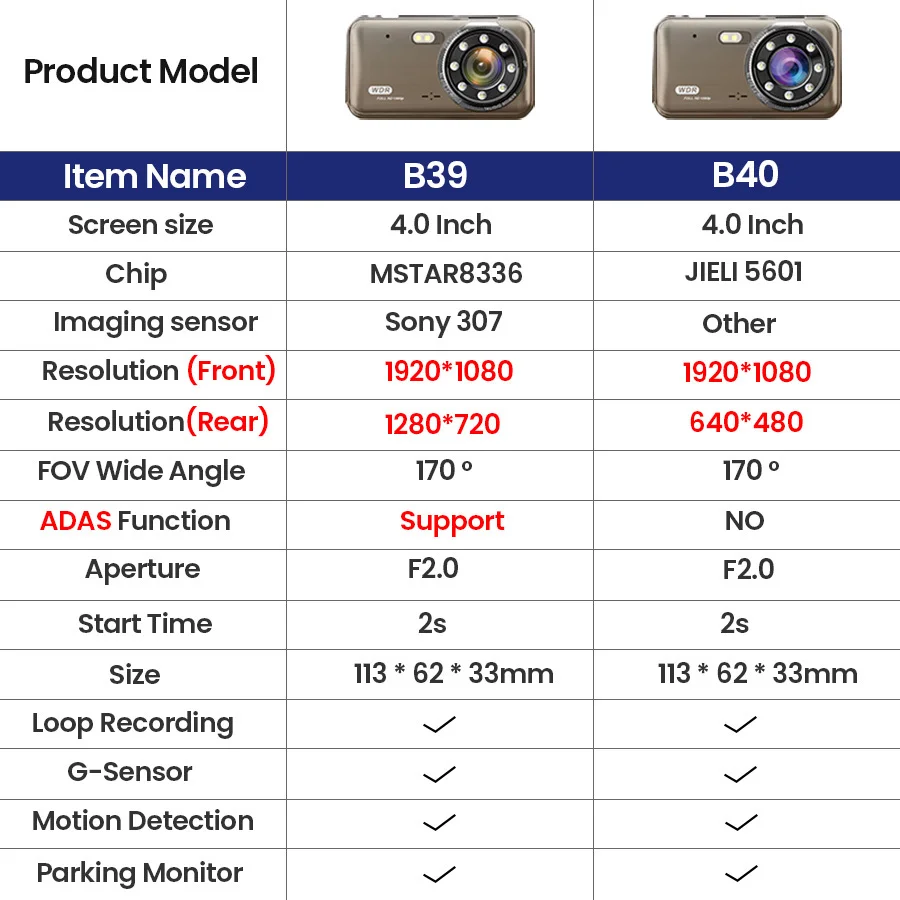 B39 фронтальная камера Датчик изображения Sony IMX307 и 6-объектив качества недеформирующейся изображения, вместе с 170 ° широкоугольный объектив, захватывает вся дорога картина в 1440P высокого разрешения. 8 светодиодных ламп автоматического включения/выключения. Когда видеорегистратор темнеет, светодиодная подсветка включится автоматически.