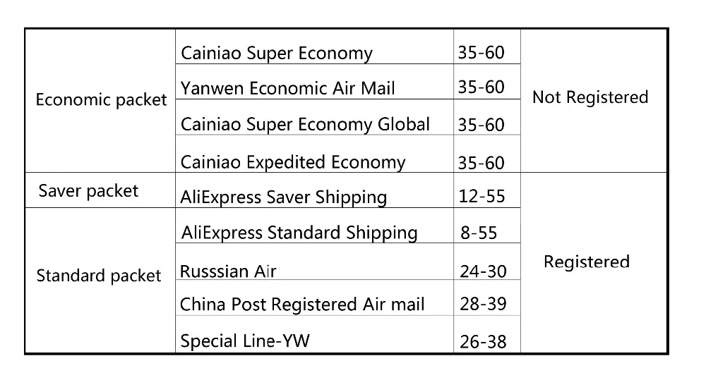 2. Пожалуйста, обратите внимание, что срок доставки для Почта Китая General Packet Plus, Почта Китая Registered Air Mail и AliExpress Стандартная доставка составляет 16-35 рабочих дней. В чехол особых обстоятельств, как, например, погода, праздники, корректировки политики, обычаев, а также отдаленных районах, время доставки будет задержана. Спасибо за понимание.