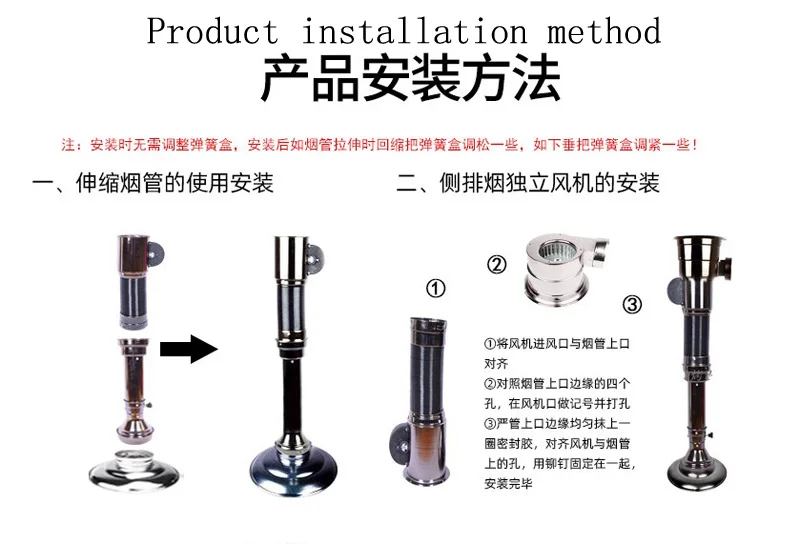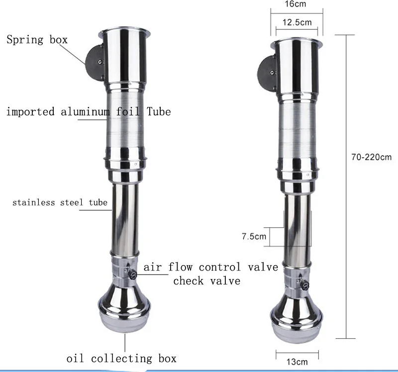 Опишите длину полумедной корейской выхлопной трубы около 74 см после сжатия, а верхний предел-около 220 см (не рекомендуется использовать в 220 см, что повлияет на срок службы весны). Есть масло порт с контрольный клапан, которые могут быть выполнены по индивидуальному заказу в соответствии с расстояние между домами (не рекомендуется погружать более 2,5 метров). Материал имеет металлическое покрытие на обоих концах. Середина соединена с импортным шлангом из алюминиевой фольги из Кореи. Нижняя трубка покрыта нержавеющей сталью. Интерьер оснащен импортной пружиной. Он оснащен пружинной коробкой (аналогичной принципу работы шторной двери) и может растягиваться вертикально вверх и вниз в любое положение. Фиксированной. Внутренний диаметр подключен к Основная труба: 12,5 см (квадратная труба открытие 12,5 см) Внешний диаметр подключен к основной трубы: 16 см для полости рта диаметр: 10 см Дымовые трубы могут быть настроены с крышками 20 см, 25 см, 30 см, 36 см, 40 см, 45 см, 50 см, 57 см по мере необходимости (Примечание: существует небольшая погрешность в определенном размере, в зависимости от размера продукта) Размеры продукта, включая различные SKUs различных размеров.