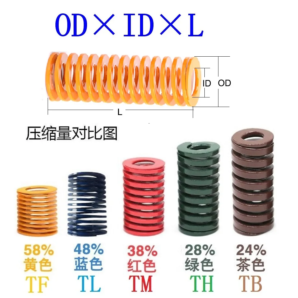 [Применимые области]: пружины пресс-формы широко используются в штамповочных штампах, штампах для литья металла, пластиковых формах и других эластичных машинах и оборудовании для точного движения и автомобилях. Описание: желтый и синий в основном используются для сборки пластиковых форм. Красный, зеленый и коричневый в основном используются для сборки оборудования.