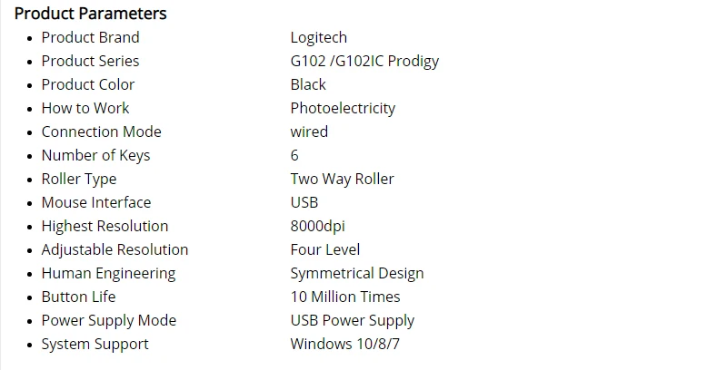 1. Если продукт logitech часто обновляет стиль продукта, мы берем Окончательный стиль продукта, который вы получите, если у вас есть возражения против продукта, вы можете просмотреть покупку продукта S / N, URL-это: //support.logitech.com.cn/zh_cn/home 2. Из-за необходимости управления, контроля и отслеживания товаров и упаковки, соответственно, продукт Logitech S/N и P/N в упаковке, S/N и P/N, как правило, не одинаковый, это нормальное феномен Особенности Для улучшения точности Игра оптические датчики давления Наслаждайтесь небывалым прецизионным опытом, чтобы открыть свой потенциал. G102 оснащен новым датчиком, разработанным в США и изготовленным в Швейцария. Датчик 200-6000 DPI обеспечивает превосходную точность, скорость отслеживания и совместимость, что позволяет лучше управлять независимо от стиля игрового процесса. Отличная консистенция и точность датчика означает, что вы можете тренировать мышцы в соответствии с ощущением, а не просто визуально прицелиться. * * Изменение настроек DPI по умолчанию необходимо использовать программное обеспечение Logitech game Классический дизайн Удобные и знаком Дизайн G102 вдохновлен известными игровыми мышками Logitech G100S, классическими линиями и лаконичной конструкцией. Его привычный дизайн пользуется популярностью у игроков по всему миру и у специалистов по электронному спорту, и мы реформируем и оптимизируем универсальность, долговечность и комфорт повседневного использования как внутри, так и снаружи. Производительность Игрового уровня До 8 раз быстрее, чем мышь Logitech standard G102 Prodigy поддерживает связь до 1000 сообщений в секунду-в восемь раз быстрее, чем стандартная мышь. Это означает, что ответ на экран почти в режиме реального времени, когда вы двигаетесь или нажимаете мышь. Расширенная ключевая система натяжения Просто нажмите то же самое Расширенная система натяжения клавиш, нажатие левой и правой кнопкой мыши в режиме «клик-to-be», уменьшение нажатия на требуемое давление, при этом достигается отличное качество нажатия, чувствительность и устойчивость. Качество и опыт, которые вы заслуживаете Легендарный Logitech качества Более 30 лет компания Logitech развивает инновации в области технологий, а также развивает аудио, офисы и игровые технологии. Высококачественные продукты Logitech сосредоточены на пользовательском процессе, чтобы помочь вам реализовать весь потенциал. Каждое игровое оборудование тщательно разработано и протестировано нашими высококачественными научно-исследовательскими лабораториями, с высоким уровнем производительности, что позволяет вам наслаждаться идеальным игровым опытом. Программируемые RGB LED подсветка До 16,8 миллионов цветов на выбор Выберите до 16,8 миллионов цветов и различных уровней яркости, чтобы соответствовать вашему стилю, системе или окружающей среде. Скачайте программное обеспечение Logitech Game, которое получает более 300 игровых профилей и реагирует на действия в играх для интеллектуального Блика. * * Изменение настроек подсветки необходимо использовать игровое по Logitech.Шесть программируемых клавиш По индивидуальному заказу более строгий контроль за Игровая мышь Logitech G102 Prodigy может использоваться непосредственно после распаковки или через игровое по Logitech для полной настройки. Расширенные клиенты могут настроить любой из шести клавиш, чтобы упрощения работы в играх. * * Изменить настройки кнопок н