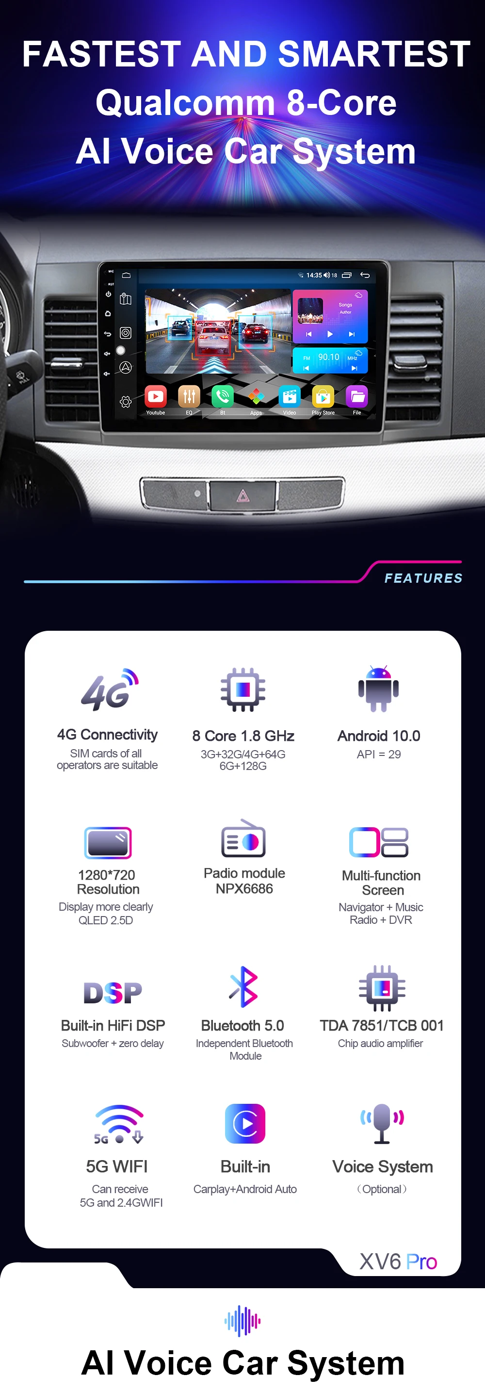 XIMA XV6 Pro DSP оснащенный DTS HiFi уровень цифрового звука эта технология может регулировать объемный звук вверх и вниз, так что значительно снижает уровень шума и делает эффект преобразования звука максимально эффективным, чтобы вы могли наслаждаться высококачественная музыкальная производительность в вашем автомобиле