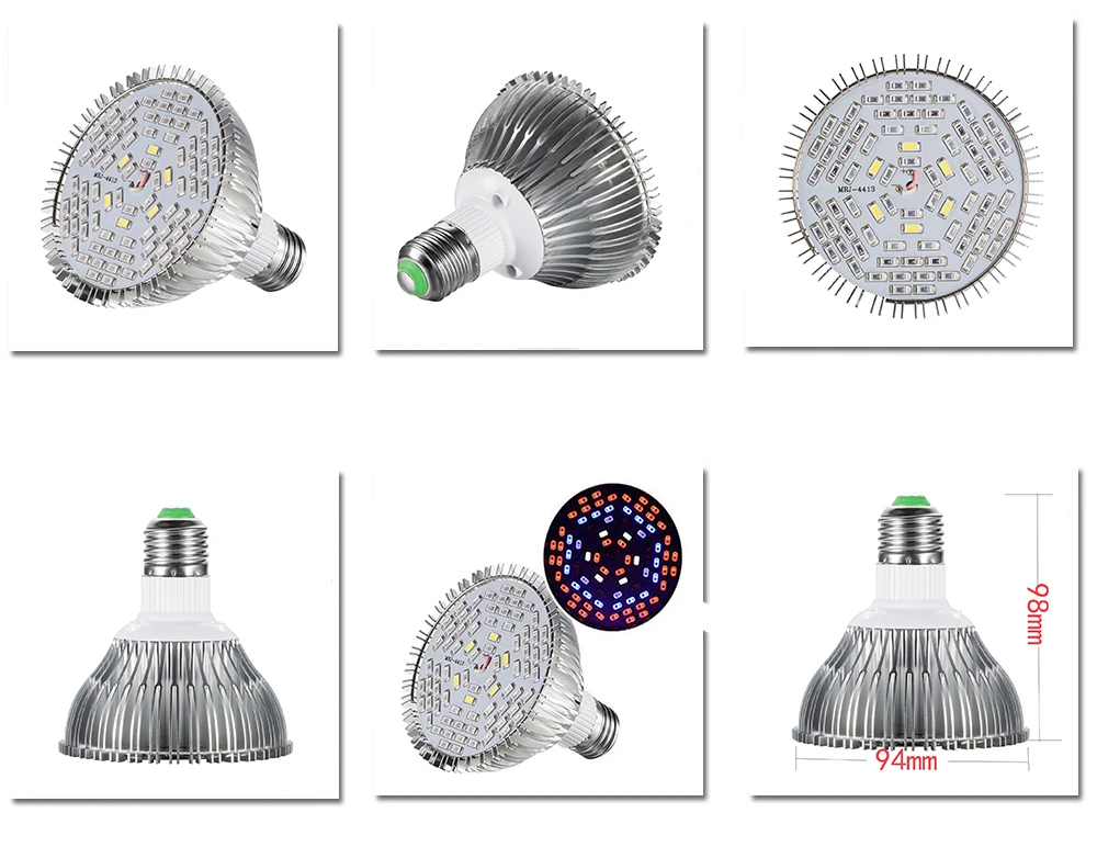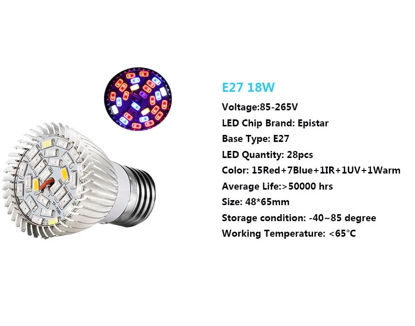Технические характеристики: Мощность лампы: 18 Вт/30 Вт/50 Вт/80 Вт Выходная мощность: 10 Вт/15 Вт/25 Вт/45 Вт Базовый тип: E27 Входное напряжение: AC85 ~ 265 в Оболочки Материал: Алюминий Тип чипа: SMD5730 Светодиодный Длина волны: Красный: 640нм ~ 670нм/синий: 450нм ~ 470нм/ИК: 730нм/УФ: 380нм/белый: 6500 К/Теплый: 3000 К Срок службы: >50000 ч Рабочая температура: -20 ~ 40 Цельсия Угол луча: 180 градусов Гарантия: 2 года Эта лампа подходит для: растительного ростка, цветения, фруктов, спелых и овощей, а также для спец Посылка содержание: 1 * Светодиодный светильник для выращивания