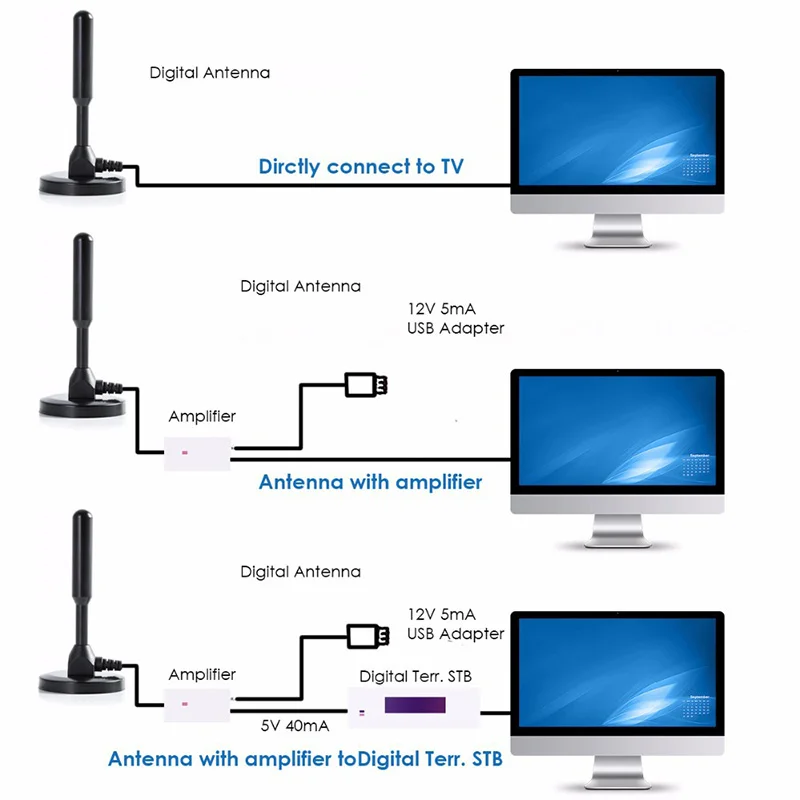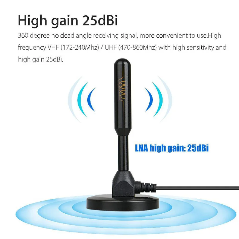 Особенности: -- Прочный enougn и идеально подходит для цифрового эфирного ТВ-приемника DVB-T. Подходит для использования в помещении и на улице. -Повышение силы и качества цифрового и аналогового сигнала. Обеспечивает дополнительную четкость обзора для вашего ПК/ноутбука. -Магнитное монтажное основание, легко установить и просто подключить к DVB-T палке. Незаменимый инструмент для usb-флешки DVB-T. Параметры Название продукта: комнатная антенна Коэффициент усиления антенны: около 30dBi Импеданс: 75ohm Цвет: черный Длина кабеля: 3 м Цвет: черный Питание от USB: 5 В Частота: 460-862 МГц Разъем: ТВ коаксиальный штекер Упаковочный лист 1 * антенна 1 * усилитель сигнала 1 * конвертер 1 * Инструкция по эксплуатации