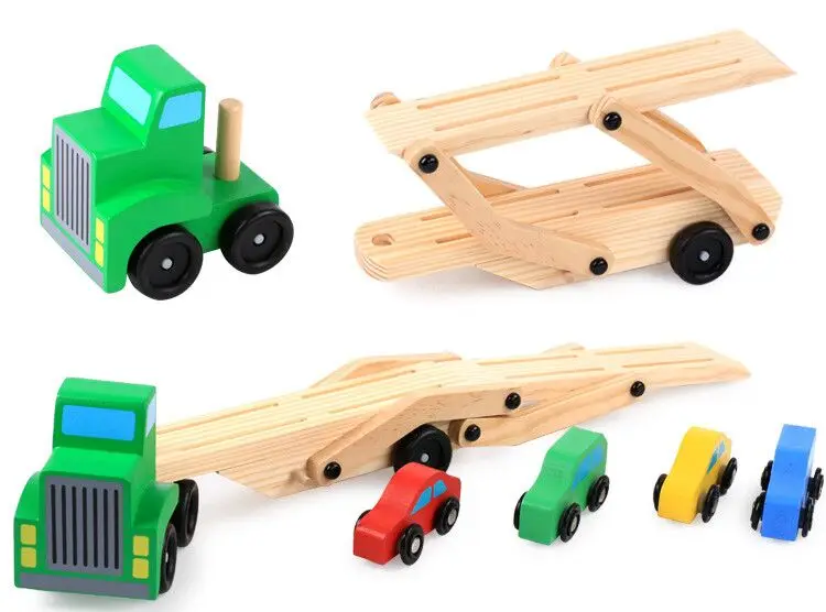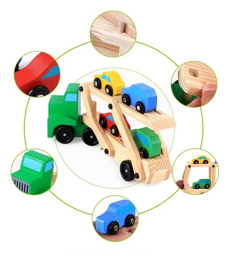 This item is a double decker truck play set, which is made by high quality wood material, safe and durable for playing. Wooden play set with a truck and four mini cars. Easy-load and lower ramps provide two levels for the vehicles. Encourages motor skills and imaginative play.
