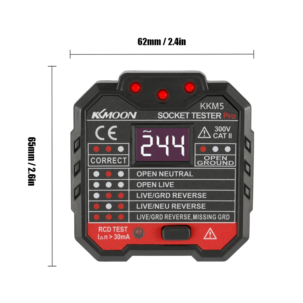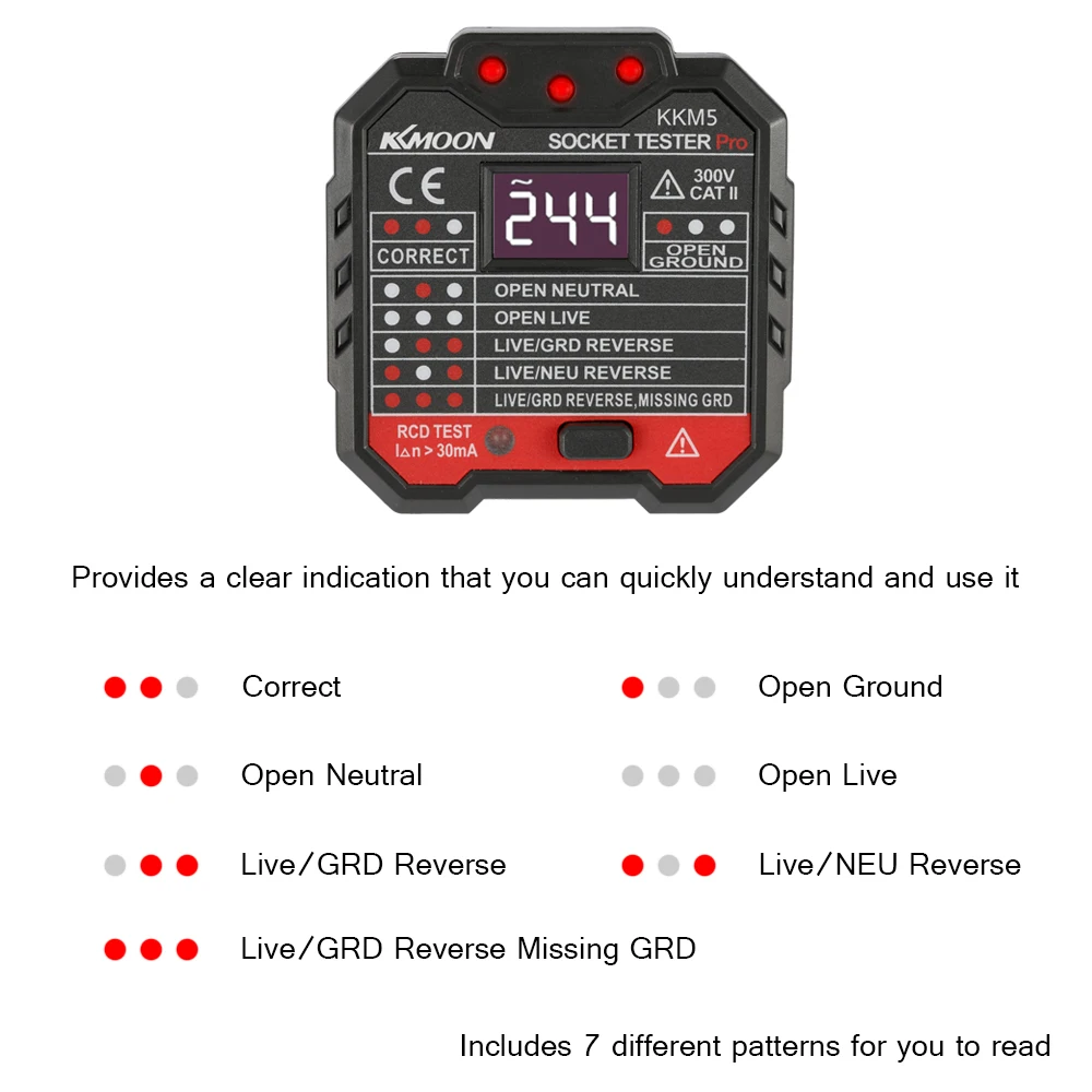 Он имеет большую и удобную таблицу ошибок. Включает в себя 7 различных моделей для чтения: правильный, открытый, Открытый нейтральный, открытый Live, Live/GRD Reverse, Live/NEU Reverse, Live/GRD Reverse Missing GRD. Обеспечивает четкую индикацию того, что вы можете быстро понять и использовать его.