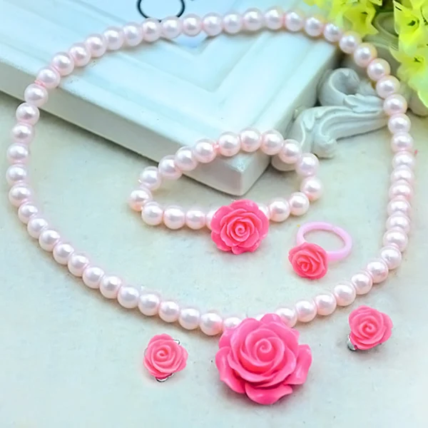 Kids Girls Child Pearl Flower Shape Necklace + Bracelet + Ring + Ear Clips Jewelry Set SER88
