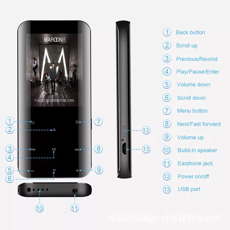 1. Воспроизведение музыки, поддержка MP3, WMA, OGG и APE, FLAC, WAV, AAC-LC. 2. Функция запуска Bluetooth 4,1 3, 3D изогнутая поверхность, сенсорная кнопка 4, встроенный динамик 5, функция записи, MP3, WAV формат 6, функция fm-радио 7. Поддержка чтения электронных книг, фотографий, календаря, секундомера, функции счетчика шагов 8, 24 языков
