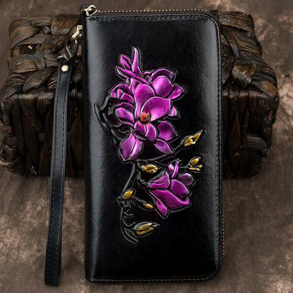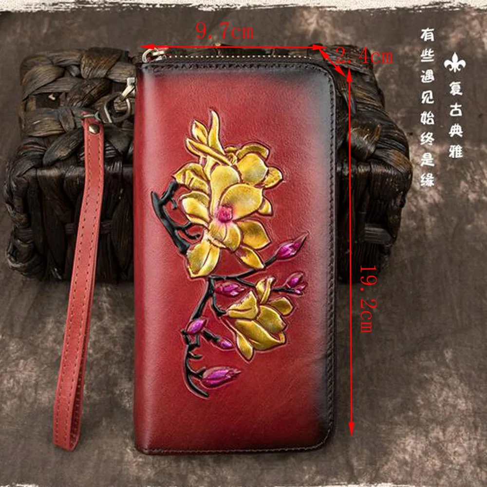 Women Clutch Wallet Zipper Bag Female ID Credit Cards Clips Floral Genuine Leather Embossed Printing Long Purse Wrist Money Bags