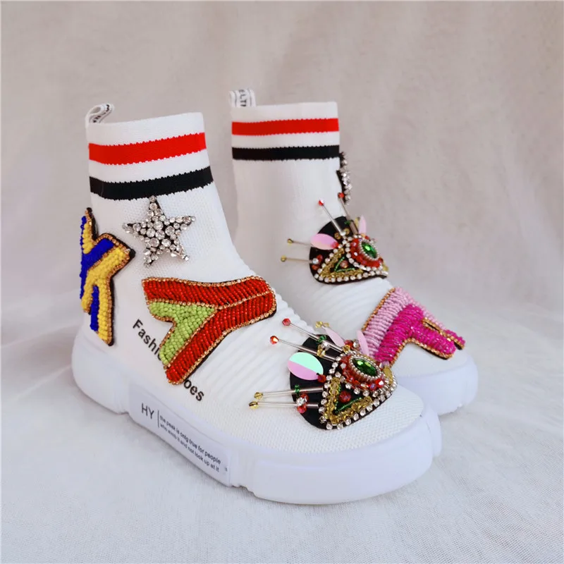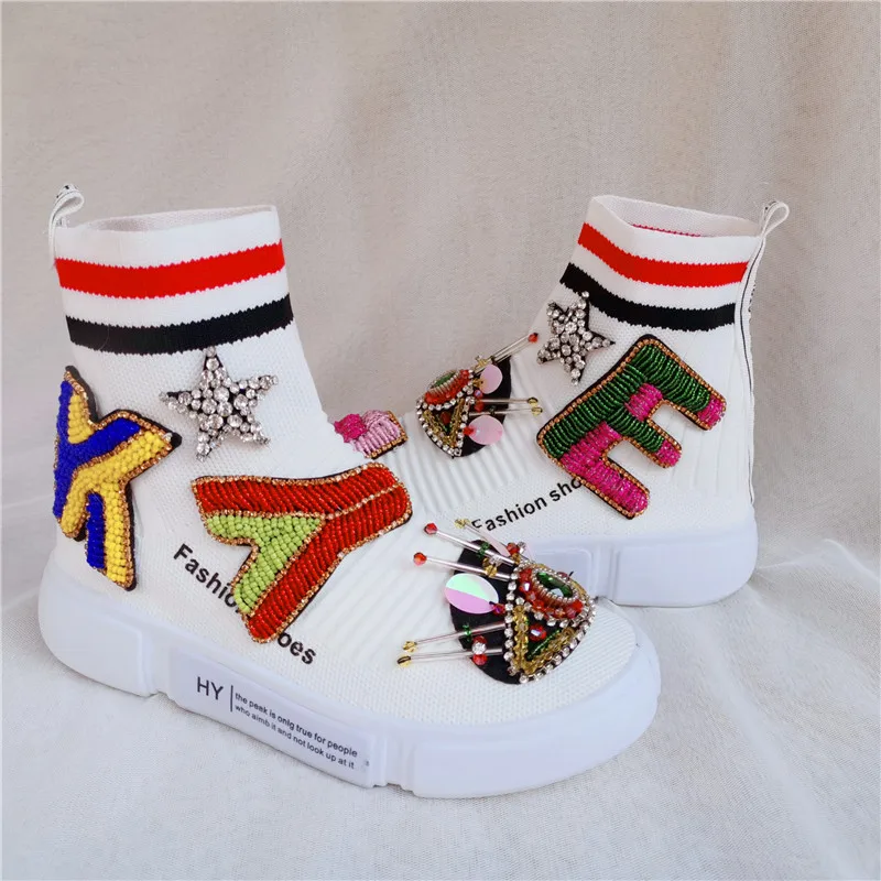 Новинка 2019, вязаные носки, обувь с алмазными буквами, Уличная обувь с высокой толстой подошвой, повседневная женская обувь с высоким берцем