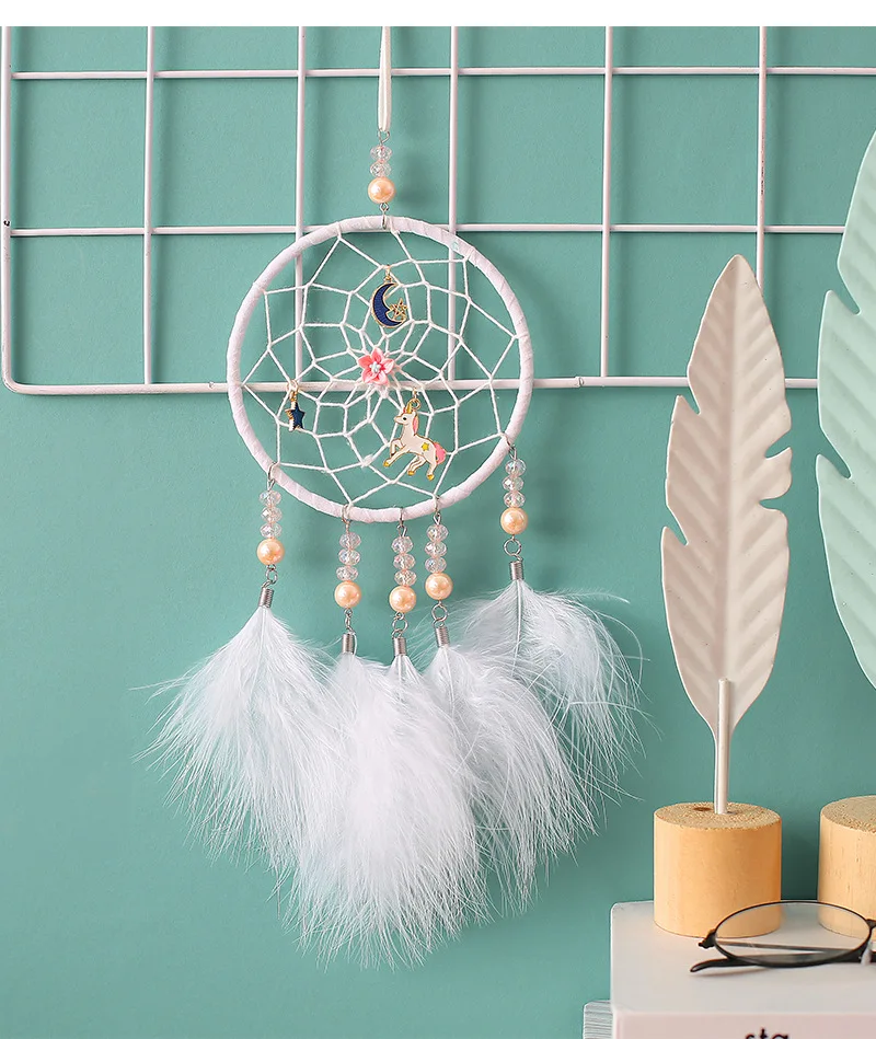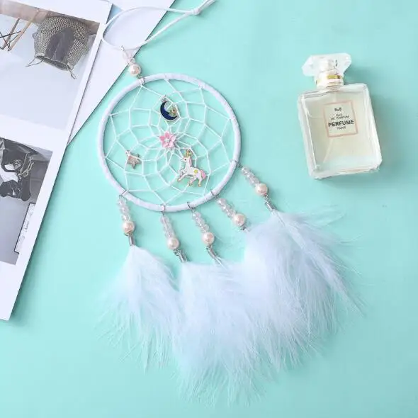 Новый Ночной светильник с единорогом, Ловец снов, декоративная лампа, подвесной подарок на день рождения, ручная работа, перо, шерстяной шар, жемчуг, спальня, звезда, луна