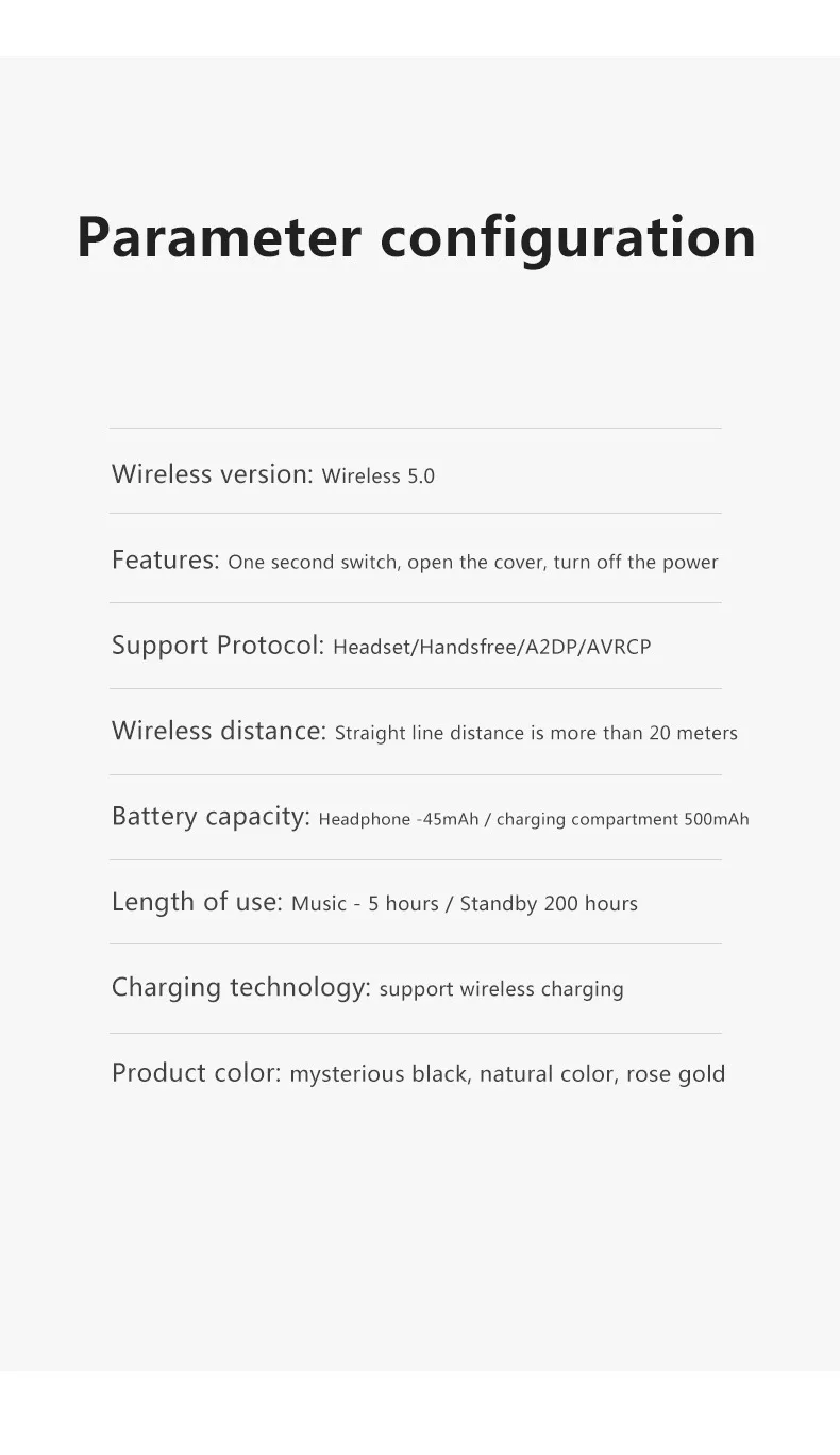 Модель продукта: N70 Версия Bluetooth: 5,0 Аккумулятор для наушников: 50 мАч Время работы в режиме ожидания: > 100 часов Время работы в разговорном режиме:> 4,5 часов Протокол Bluetooth: HSP / HFP / A2DP / AVRCP Слушайте песню: 4 часа Батарея: полимерная литиевая батарея, Наушники 200 мА, зарядный отсек 500 мА · ч. Время зарядки: 1 час зарядки в течение 40-50 минут (поддержка беспроводной зарядки) Стандарт: пара наушников/зарядный отсек/usb-кабель для зарядки/Руководство/упаковка Метод сопряжения 1. Откройте посылка и вставьте наушники влево и вправо в зарядную комнату. Гарнитура загорается красным цветом. Если это не светильник, пожалуйста, зарядите аккумулятор. 2. Гарнитура автоматически включается из зарядного устройства, автоматически соединяется, ожидание около 30 секунд, и один из индикаторов наушников выключен. Другая гарнитура мигает красным и синим цветом, и устройство является основным ухом. В то же время, соответствие успешно. 3. Включите Bluetooth телефон, найдите название гарнитуры Bluetooth «N70», а затем нажмите «подключиться». 4 после использования гарнитуры положите ее обратно в зарядную комнату, и гарнитура автоматически выключится и зарядится. 5 снова Используйте гарнитуру, снимите ее с зарядного устройства и включите ее автоматически. Автоматическое Сопряжение также подключается к телефону.