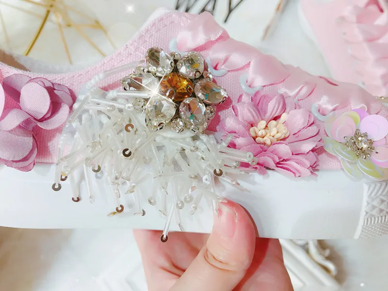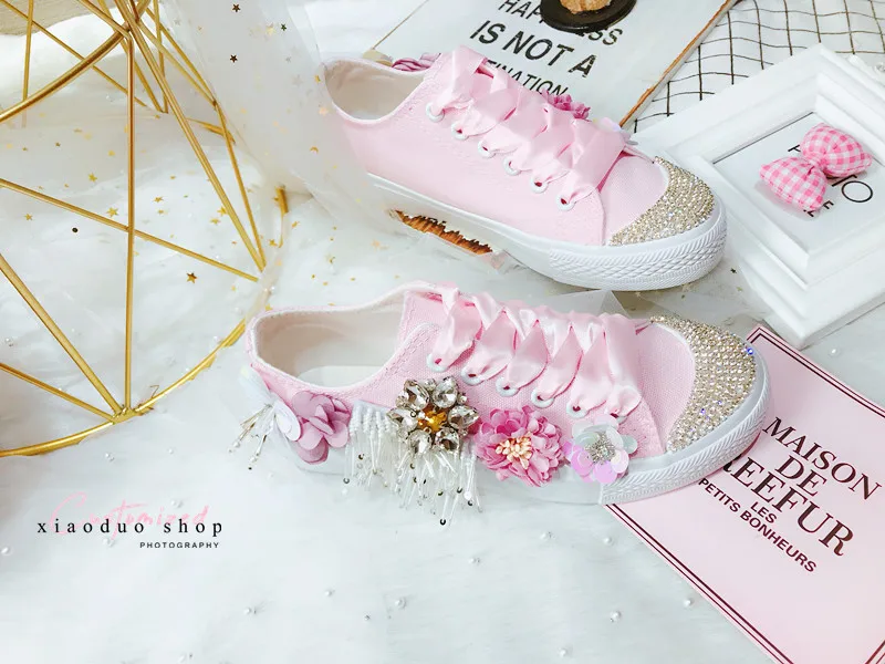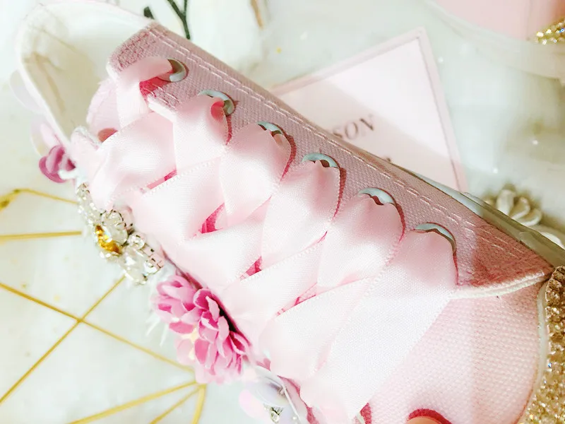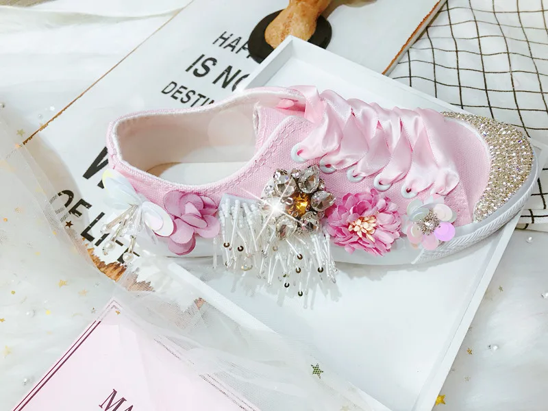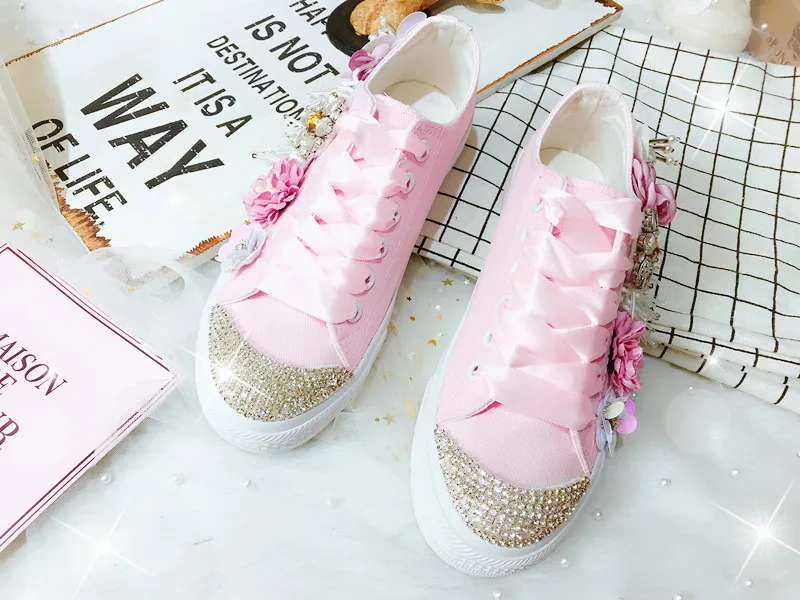 Женская обувь ручной работы, розовая шелковая лента с жемчужинами и цветами, Модная студенческая парусиновая обувь на плоской подошве, осень 2019