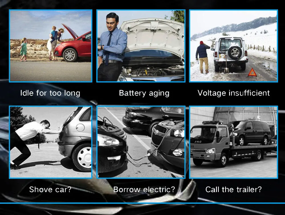 Quick starting 12V gasoline car (up to 5.0L) and diesel car (up to 3.0L) just in seconds when the car battery dead. When you are travelling in some untraversed place, and your car battery is out of power, you can use this car jump starter to start your car.