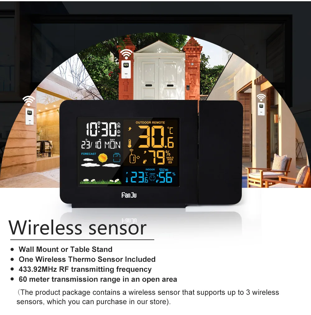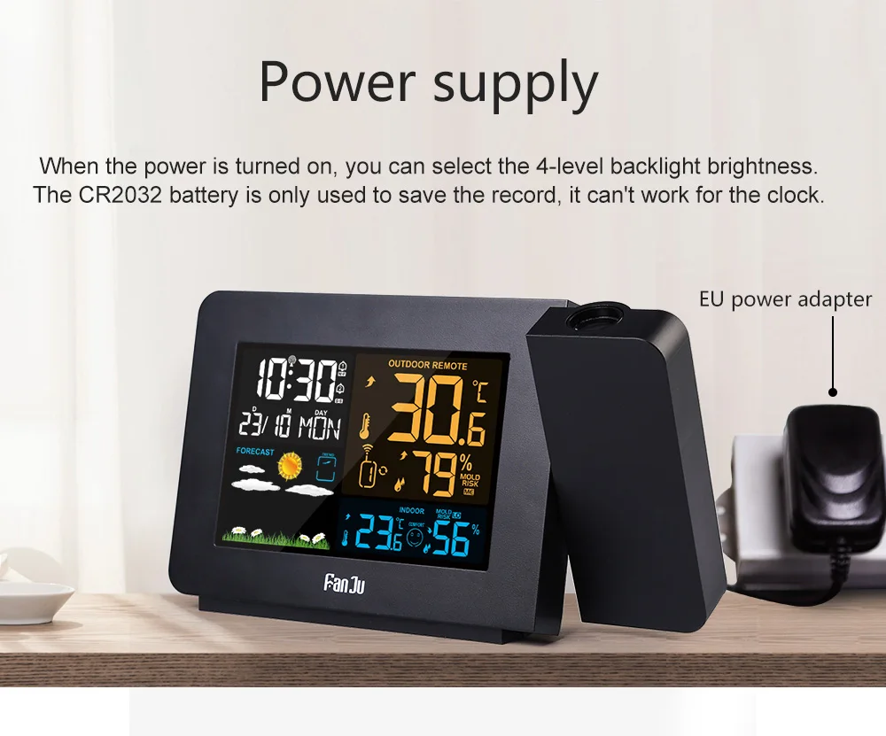 2019Многофункциональный Метеостанция цифровой проекционный будильник, новый дизайн, с использованием более четкого цветного экрана. Вы можете увидеть время, календарь, температуру и влажность в помещении и на улице, комфорт, а также погода для будущего времени. В то же время, он имеет проекцию, которую можно регулировать под несколькими углами. Время, наружная и внутренняя температуры могут быть проецированы все время. Когда вы находитесь вдали от дома, вы можете отключить блок питания. В это время аккумулятор сохранит ваши записи до тех пор, пока будильник не восстановится, когда вы вернетесь домой.