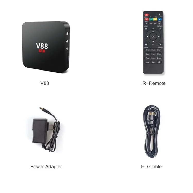 Мощность зарядное устройство адаптер HDMI кабель IR дистанционный пульт Руководство пользователя I/O 1 * HDMI 2,0 до 4K x 2K 4 * USB хост usb порт 1 * SPDIF коаксиальный кабель 1 * Поддержка tf-карт 1 ~ 32 Гб 1 * RJ45 10/100 BaseT 1 * AV стандартное разрешение AV или Y/Pb/Pr сигнал 1 * Мощность вход 5В/2A