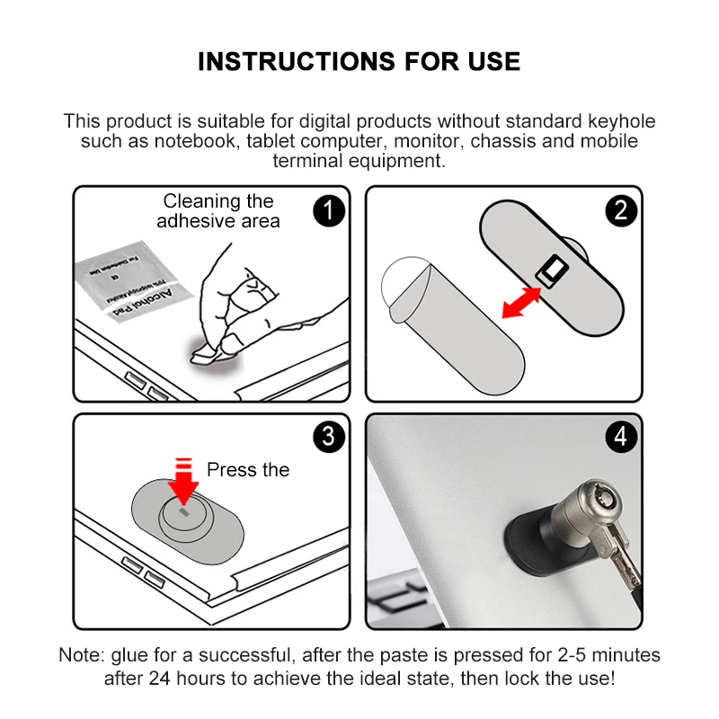 Clean the laptop surface with the alcohol pad. Tear off the sicker back film and fixe the lock on the laptop by the sticker. Press the fixed lock for 2-5 minutes. Wait for 24 hours and then to use it .