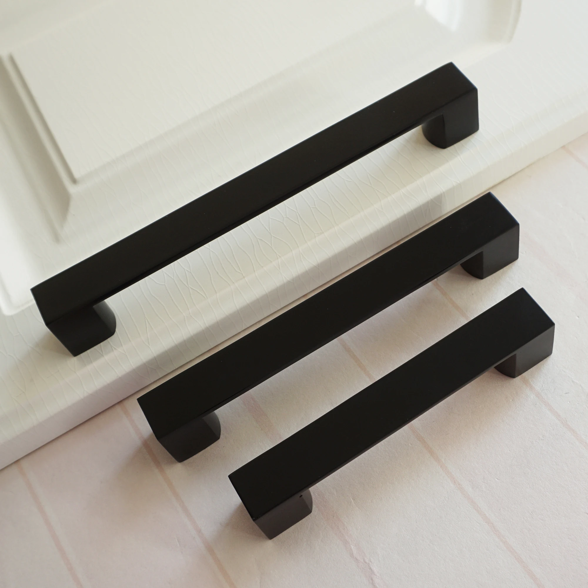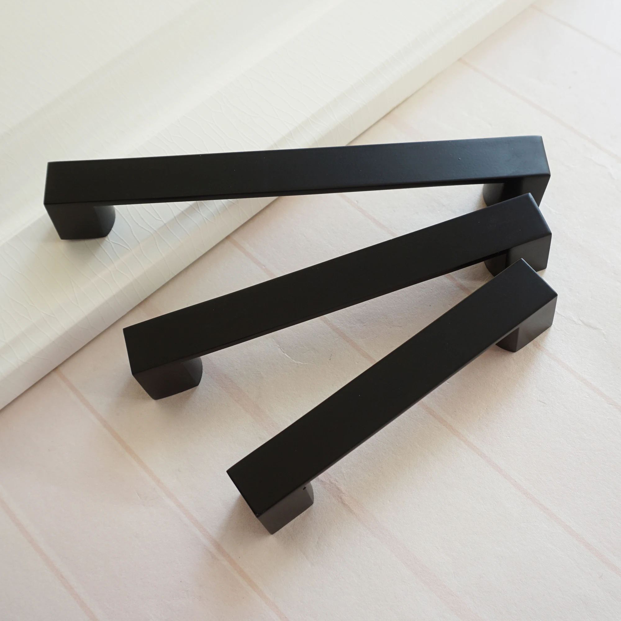 The price is for one piece Material: Zinc Alloy Color: Black 4 sizes to choose from. Measurements: 1. A Handle-- Length: 5" (128 mm ) Width: 0.78" (20 mm) Height: 1.02" (26 mm) Hole Spacing (center to center): 3.75" (96mm) 2.B Handle Length: 6.3" (160mm ) Width: 0.78" (20mm) Height: 1.02" (26 mm) Hole Spacing (center to center): 5.00" (128 mm) 3.C Handle Length: 7.55" (192 mm ) Width: 0.78" (20mm) Height: 1.02" (26mm) Hole Spacing (center to center): 6.3" (160 mm) 4.D Handle Length:8.8" (224 mm ) Width: 078" (20 mm) Height: 1.02" (26 mm) Hole Spacing (center to center): 7.55" (192 mm) 2 Screws included. Length 25mm. M4 Please visit our shop for more knobs: