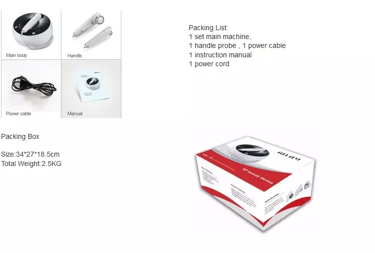 Шаг 1: Очистите кожу перед использованием Шаг 2: Установите головку лица или головку тела (по часовой стрелке) Шаг 3: используйте чистую хлопчатобумажную ткань для дезинфекции зонда перед использованием Шаг 4: Подключите ручку и кабель питания Шаг 5: нанесите RF специальную эссенцию на область обработки Шаг 6: Включение питания, выберите подходящий уровень и время (вверх спиральный Наклонный стиль для работы) Шаг 7: при использовании, пожалуйста, используйте чистую хлопчатобумажную ткань, чтобы очистить зонд, а затем очистить вашу кожу. (через 10 минут Используйте увлажняющую маску, эффект лучше)