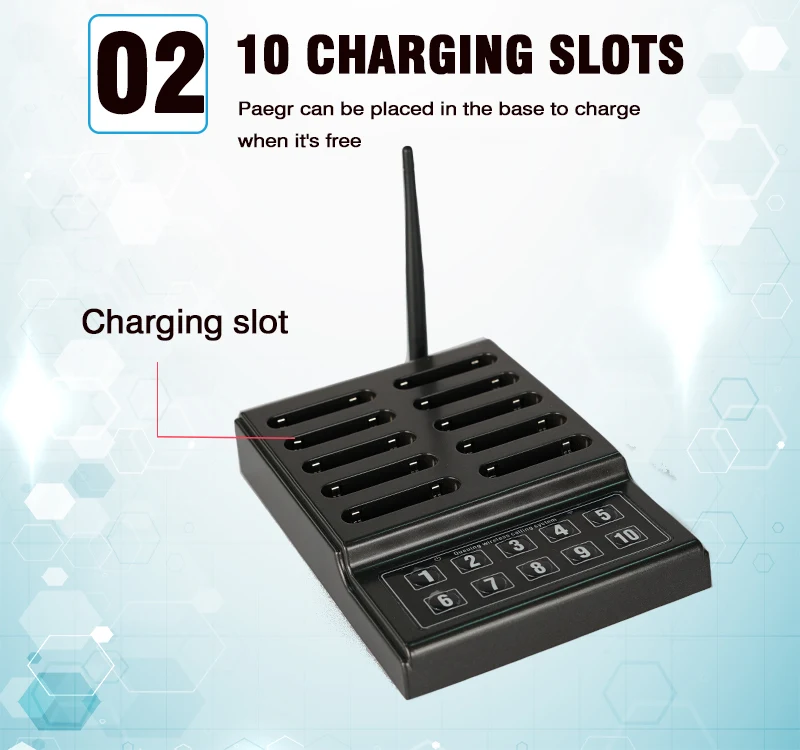 2. 10 разъемов для зарядки-пейджер может быть помещен в базу для зарядки, когда он бесплатно.