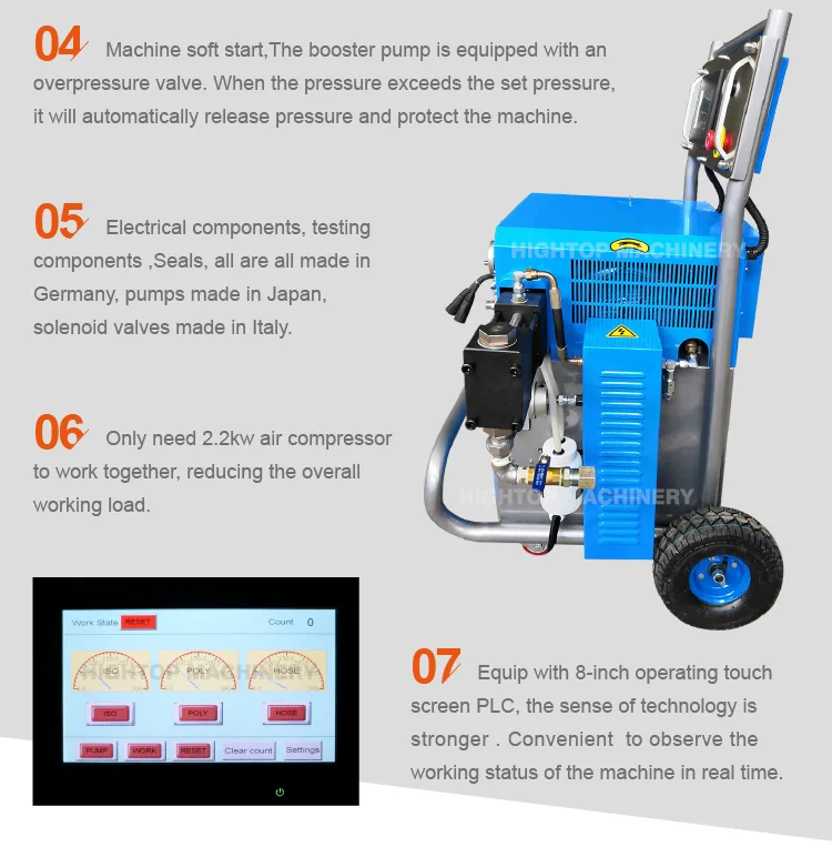 1. Гидравлический наддува устройство, с небольшим объемом, светильник вес, обладает низкой интенсивностью отказов, простота в эксплуатации, легкая работа и другие отличные характеристики; 2. Использование наиболее продвинутого метода вентиляции гарантирует максимальную стабильность работы оборудования; 3. Минимизирует скопление распыления с помощью устройства для подачи сырья; 4. Мульти-система защиты от утечки для защиты безопасности оператора; 5. Оснащен системой аварийного переключателя, помогает оператору быстро справиться с чрезвычайными обстоятельствами; 6. Отличная система отопления 380 В обеспечивает Быстрое нагревание сырья в наилучшем состоянии, ускоряет нормальную работу; 7. Цифровая счетная система может своевременно понять Оригинальное потребление; 8. Гуманизированный дизайн с операционной панелью оборудования, очень легко получить его; 9. Самая последняя распыления обладает отличными характеристиками, как небольшой объем, светильник вес, обладает низкой интенсивностью отказов и т. д.; 10. Подъемный насос использует большой метод изменения соотношения, зима также может легко питать сырье высокой вязкости