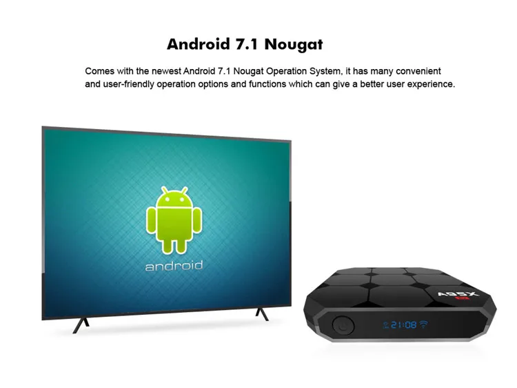 ◆OS Android 7,1 ◆ 3D жесткая 3D графика ускорение ◆ Светодиодный Дисплей, показ времени, будильник, видео статус. ◆ Поддержка декодера формат HD MPEG1/2/4,H.264,H.265, HD AVC/VC-1,RM/RMVB,Xvid/DivX3/4/5/6 ,RealVideo8/9/10 ◆ Поддержка медиа формата Avi/Rm/Rmvb/Ts/Vob/Mkv/Mov/ISO/wmv/asf/flv/dat/mpg/mpeg/Mov/mp4/ Поддержка музыкального формата MP3/WMA/AAC/WAV/OGG/AC3/DDP/TrueHD/DTS/HD/FLAC/APE ◆ Поддержка формата фото HD JPEG/BMP/GIF/PNG/TIFF ◆ Хост USB 2x USB 2,0 хост-порты, 1x порт USB 3,0 ◆ Кардридер TF карты ◆ HDD файловая система FAT16/FAT32/NTFS ◆ Поддержка подзаголовка SRT/SMI/SUB/SSA/IDX + USB ◆ Высокое качество видео выход 4K * 2K ◆ OSD тип языков английский/французский/немецкий/испанский/итальянский/и т. Д. ◆ LAN Ethernet:10/100, стандартный RJ-45 ◆ Беспроводная поддержка 802,11 b/g/n 2,4G ◆ Мышь/клавиатура Поддержка Мышь и клавиатуры через USB; Поддержка 2,4 ГГц беспроводной Мышь и клавиатура через 2,4 ГГц USB донгл ◆ HDMI 2,0 4K * 2K 60Hz ◆ SPDIF выход ◆ Поддержка AV и YUV ◆ Поддержка HDR