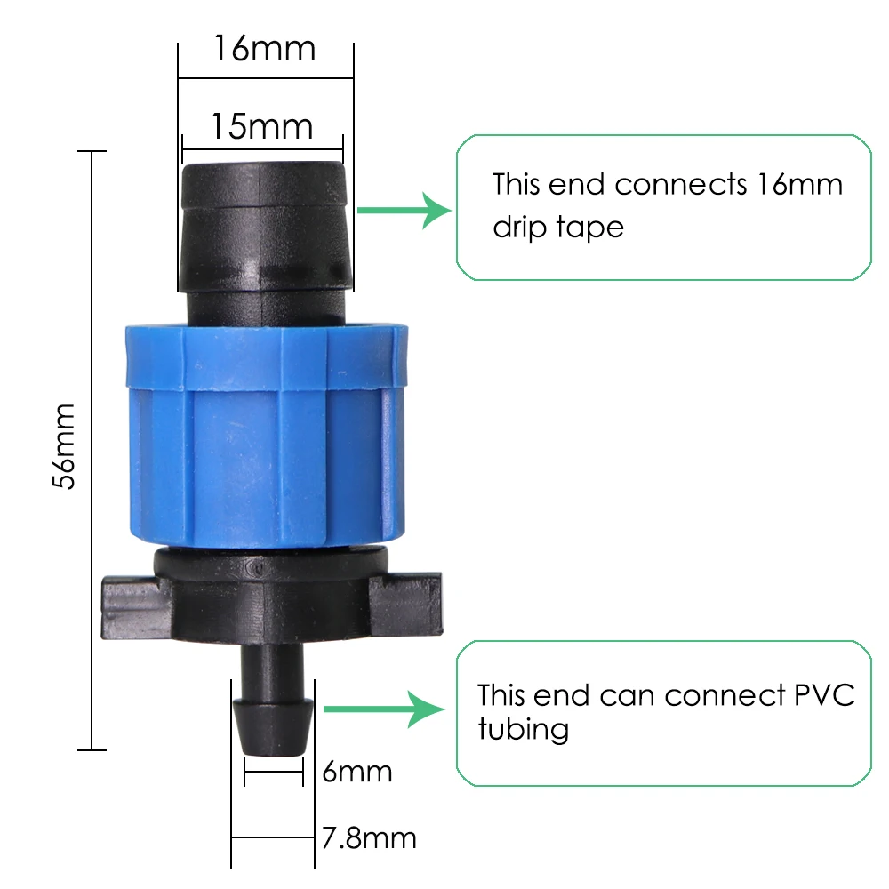- GSCon16MU-2T-2135YY фитинг используется для подключения 5/8 "капельного скотча к магистральной трубе. Просто вставьте отверстие в магистральную трубу, подключите капельную ленту к концу ленты фитинга и вставьте колючий конец в Пробивное отверстие.