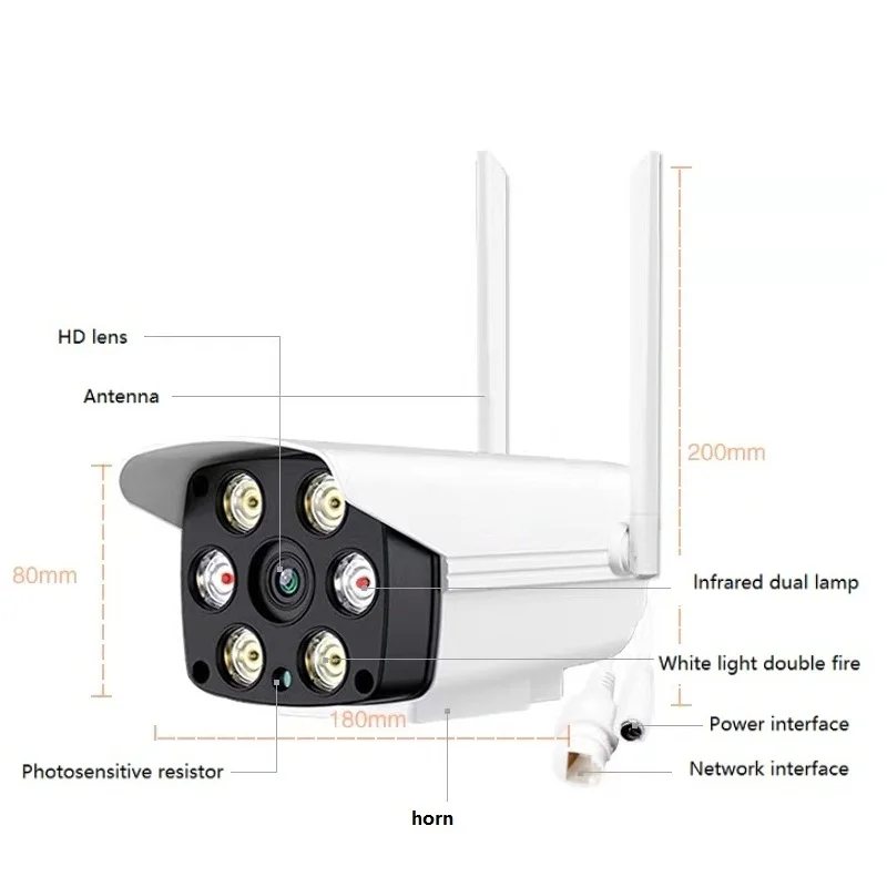 IP66 Водонепроницаемость для наружного и внутреннего применения: он достаточно прочен, чтобы выдерживать жесткие погодные условия, дождь, снег, жаркий день и т. д. обеспечивает отличную производительность при установке на открытом воздухе. Особенности: 1. Разрешение HD real 2,0 мегапикселей 1080P/720p 2. Простота установки: Подключение Wi-Fi (Wi-Fi не поддерживается 5G) 3. Поддержка режима AP 4. Поддержка цветного ночного видения, мониторинга звука 5. Обнаружение движения: Отправка сообщений по электронной почте, запись видео Четкое ночное видение, 6 инфракрасных светодиодов Aaary, до 10 м 6. Поддержка записи и воспроизведения SD-карты 7. Использование в помещении и на улице, водонепроницаемость IP66 8. Встроенный микрофон, громкий динамик, Поддержка двусторонней передачи звука Упаковочный лист: 1 IP-камера с Wi-Fi 1 * кронштейн 1 * блок питания 1 * Руководство 1 * сумка для винтов 1 антенна