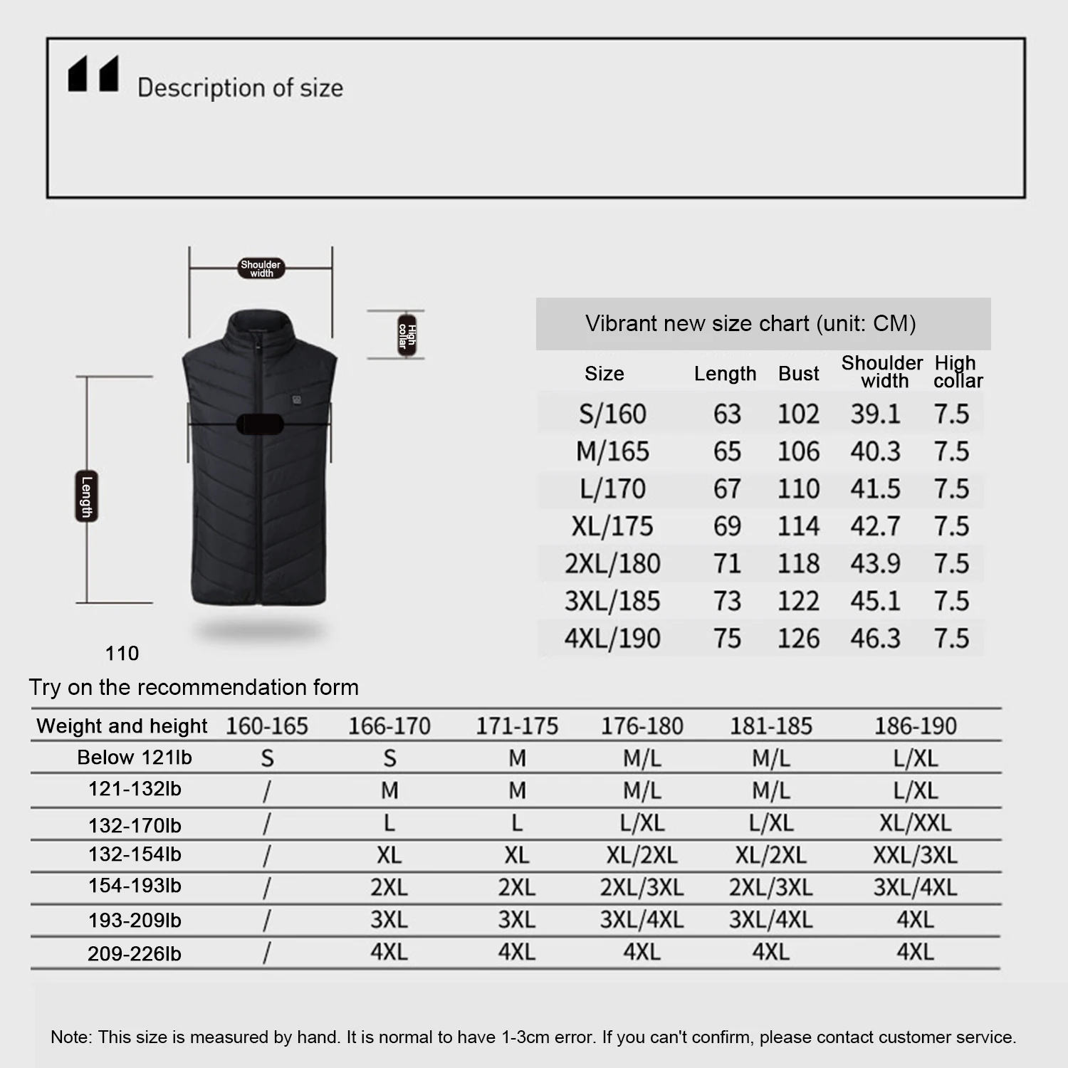 Особенности: Гуманизированный дизайн нагрева Гуманная нагревательная часть предназначена для обогрева и может быстро нагреваться даже в экстремально холодную погоду. Идеально подходит для всех видов активного отдыха, таких как подметание снега, катание на лыжах, Кемпинг, Пешие прогулки. Он также очень подходит для людей, которые всегда ощущают боль в костях в холодные или дождливые дни. 3 уровней нагрева Три уровня нагрева регулируются для обеспечения широкого диапазона температур, которые достаточно высоки, чтобы выбрать наиболее комфортную температуру с помощью одной кнопки. (Энергосберегающая температура около 25 °C, комфортная температура около 35 °C, Теплая температура около 45 °C) Зарядка и стиральная безопасности Этот жилет подарит вам максимальную гибкость и воздухопроницаемость, а также водонепроницаемость. Его можно мыть вручную, а интерфейс питания изолирован и водонепроницаем. Легко ДИЗАЙН Встроенные карманы предназначены для переноски мобильного питания (не входят в комплект). Грелка может быстро нагреваться за 3 минуты. Примечание: через 2 секунды нажатия на кнопку Электрогрелка будет открываться. Идеальный подарок Доступно в семи размерах от S до XXXXL для мужчин, женщин, мальчиков и девочек. Идеально подходит для подарков на день рождения, подарков на день благодарения и рождественских подарков. Примечание: Пожалуйста, не используйте обычный размер магазина одежды. См. Таблицу Размеров GLOBAL VISION. Размеры S M L XL XXL XXXL XXXXL См дюйм сантиметр дюйм Размер, длина груди, ширина плеч, высота воротника S/160 63 102 39,1 7,5 М/165 65 106 40,3 7,5 L/170 67 110 41,5 7,5 XL/175 69 114 42,7 7,5 2XL/180 71 118 43,9 7,5 3XL/185 73 122 45,1 7,5 4XL/190 75 126 46,3 7,5