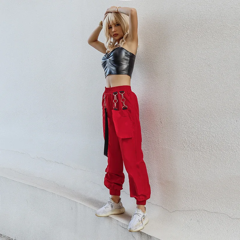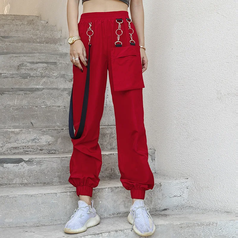 ОписаниеЖенские уличные брюки-карго, красные, черные рабочие спортивные брюки с цепочкой, Харадзюку, хип-хоп тренировочные брюки, повседневные штаны для скейтборда