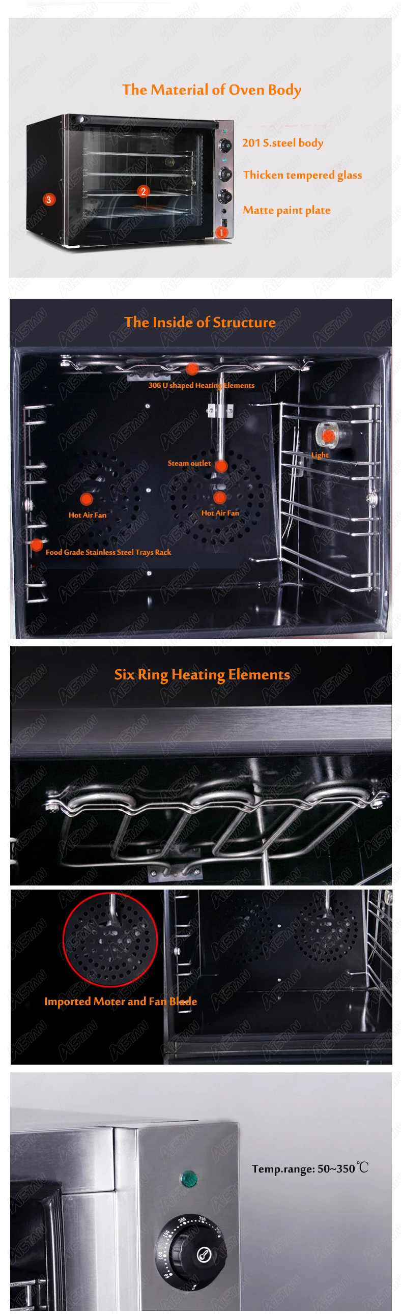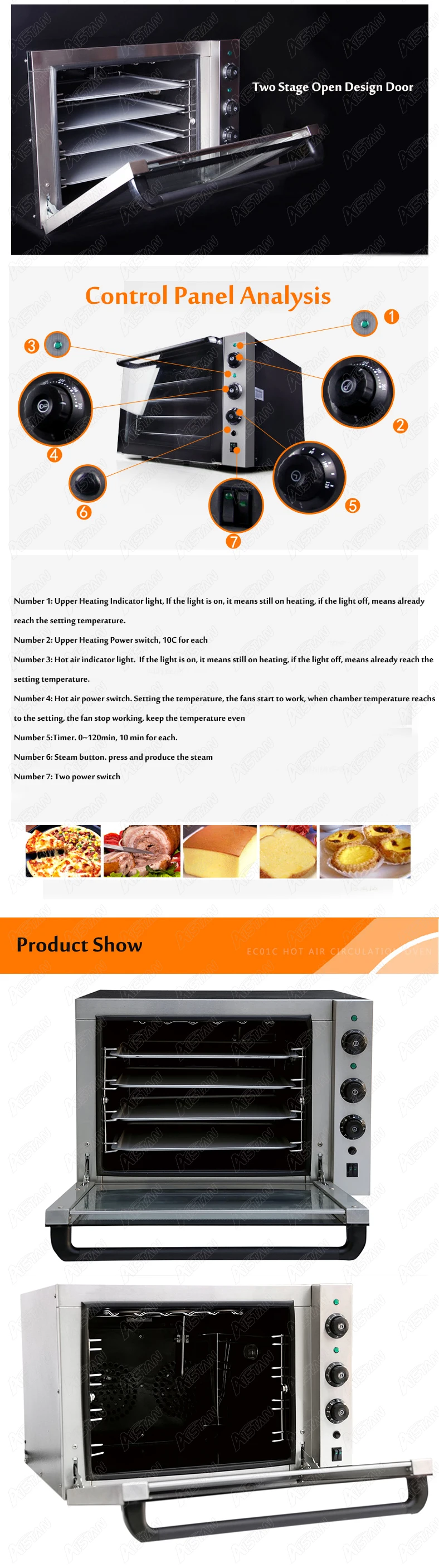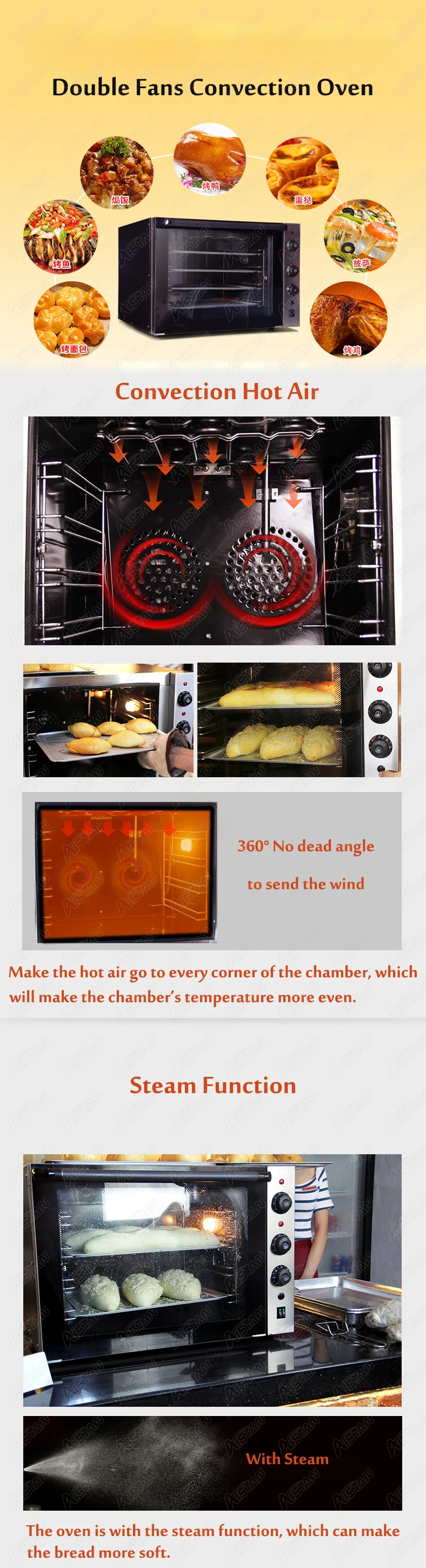 Машина является электрической духовкой из нержавеющей стали, которая имеет Четырехслойный лоток для выпечки, чтобы увеличить количество выпечки, и свободно контролируется от 0 до 350 °C. Существует также устройство циркуляции горячего воздуха для предотвращения выпечки. Машина подходит для выпечки яичных брусьев, тортов, хлеба, пиццы и других ингредиентов.