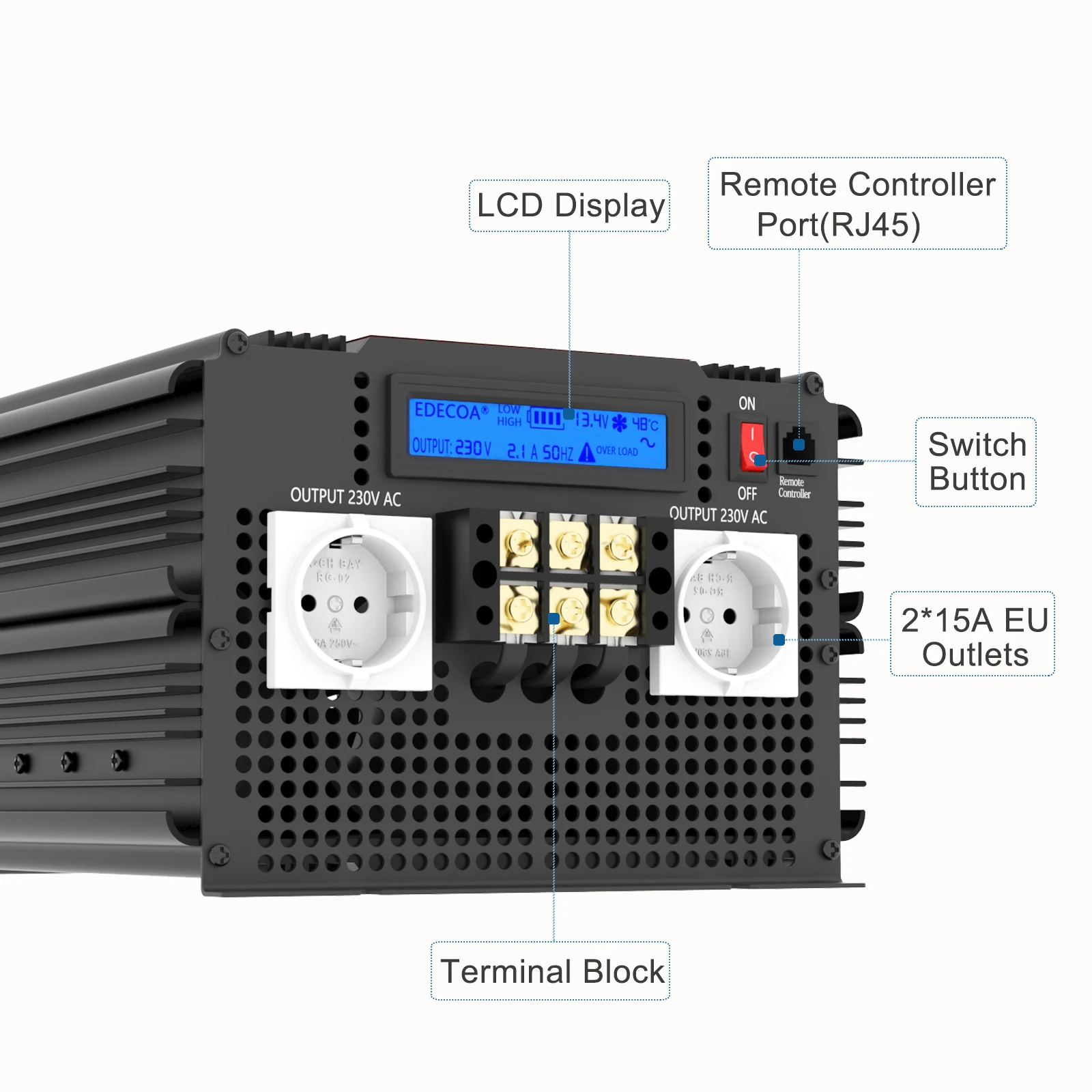 Инвертор постоянного тока в переменный Мощность инвертор 12V 230V мы можем доставить 3500W постоянного Мощность/5000W макс пик Мощность. Управляемый однополярным SPWM, выходная Синусоидальная форма сигнала более чиста, THD<3%, более низкие электромагнитные помехи.