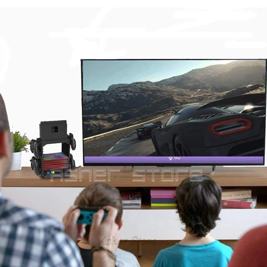 Может вмещать до 10 игровых картриджей, крючки с двух сторон для подвесных контроллеров.