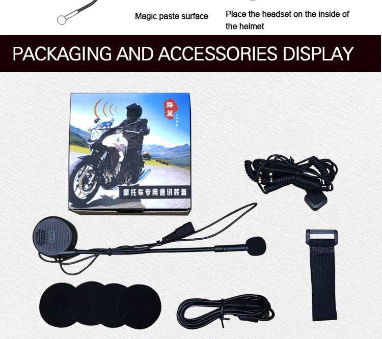 1. Гарнитура может быть установлена внутри шлема. Он может быть соединен с двумя мобильный телефон и имеет некоторые простые ведения на вашем телефоне, такие как: ответить/отклонить вызов, получить мобильный телефонный звонок автоматически, голосовой набор, управление музыкальным проигрывателем (пауза), далее (предыдущий) Управление песней, увеличение или уменьшение громкости, иначе.