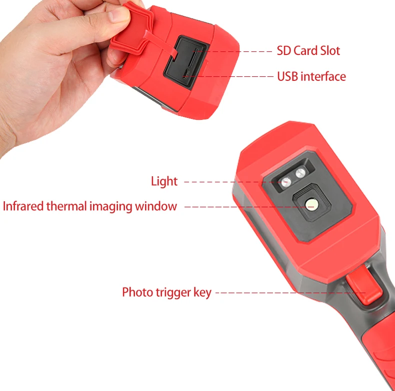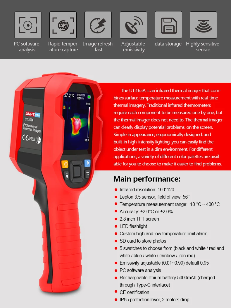 Особенности Инфракрасное Разрешение: 160*120 Датчик ledon 3,5, Поле зрения: 56 ° Диапазон измерения температуры: -10 °C ~ 400 °C Точность: ± 2,0 °C или ± 2.0% 2,8 дюймов TFT экран Светодиодный фонарик Пользовательский высокий и низкий температурный предельный сигнал Sd-карта для хранения фотографий 5 моделей на выбор (черный и белый/красный и Белый/синий/белый/радужный/Железный красный) Излучательная способность Регулируемая (0,01 ~ 0,99) по умолчанию 0,95 Программное обеспечения для подключения к компьютеру для анализа Перезаряжаемая литиевая батарея 5000 мАч (заряжается Через интерфейс Type-C) CE сертификация Уровень защиты IP65, падение 2 метра Преимущества обнаружения тепловизора: 1. Интуитивно понятный, эффективный и удобный, что делает пользователей непосредственно "видеть" Колебание температуры. 2. Тепловое состояние различных мест Анализ, предоставление дополнительной информации для суждения 3. Избегайте ошибок в суждениях, уменьшая затраты на работу и обнаруживая Низкое тепловыделение и скрытые проблемы 4. Программное обеспечение ПК для анализа данных и вывода отчетов