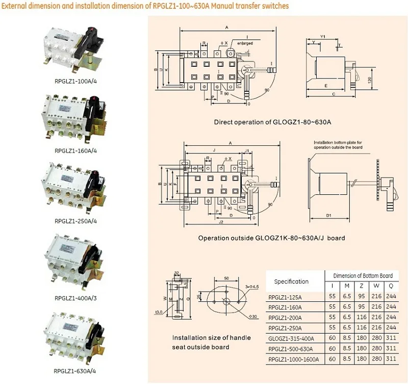 Ручное переключение переключатель RPGLZ1 подходит для замены двух комплектов низковольтной электрической цепи или замены 2 комплектов устройств на нагрузке или защитной изоляции. Режим работы: Прямая работа: ручка установлена на выключателе. Работа за пределами шкафа: ручка устанавливается вне двери распределительной платы. Продукты имеют три полюса, четыре полюса и (три полюса + ВКЛ и ВЫКЛ. Нейронный полюс). Расширенный вал используется для работы за пределами платы. Механические свойства и электрические свойства соответствуют Механическим Свойствам и Электрическое свойство RPGLZ1-80 ~ 3150A. Медный мост является стандартным, оснащенным для подключения выходных клемм выключателя.