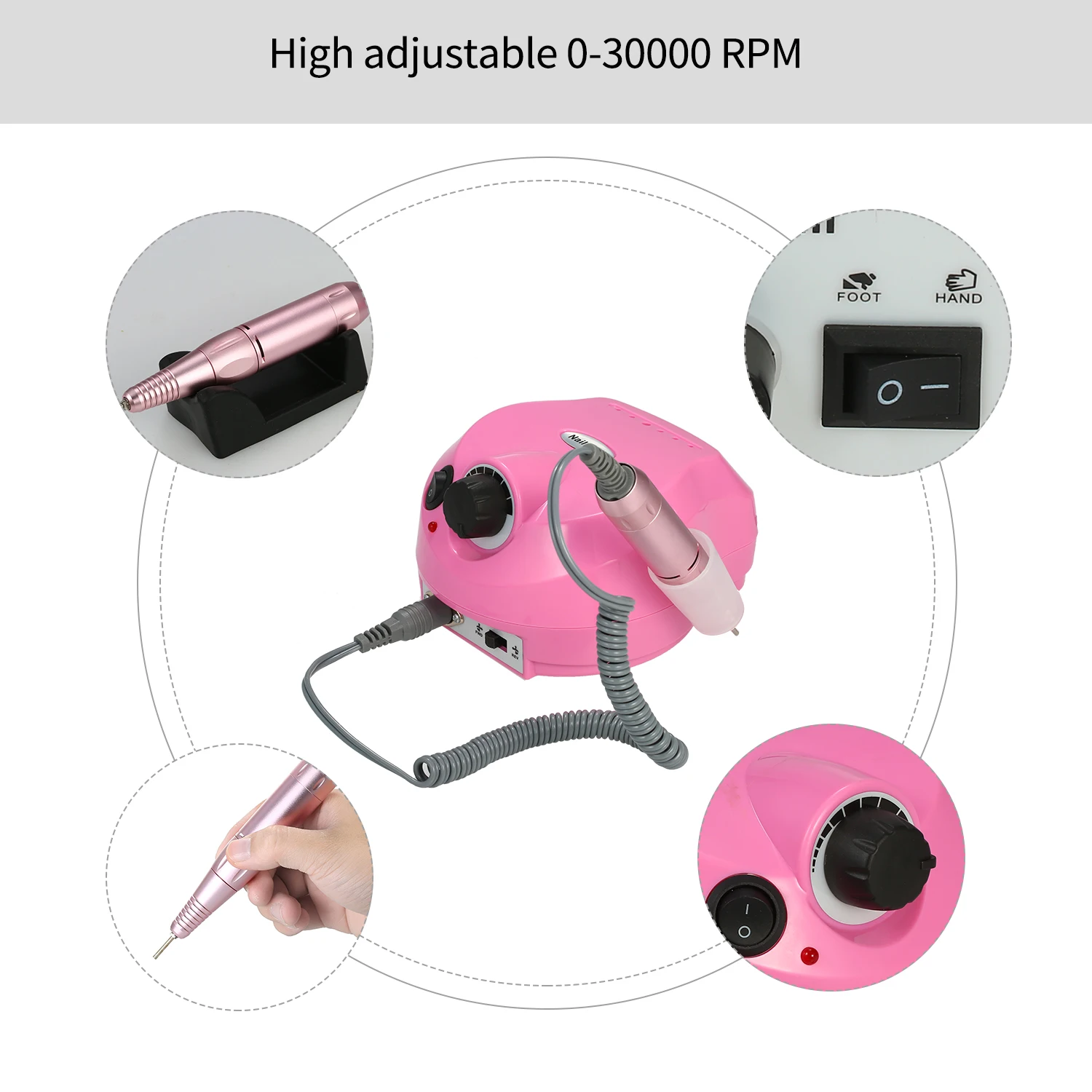 Профессиональная электрическая дрель для ногтей --- 0-30000r регулируемая скорость, вы можете выбрать скорость, которую вы хотите для различного использования. Низкий уровень шума, низкий нагрев и низкая вибрация, которые могут сделать вас комфортными при высокой скорости при использовании в салоне или дома.