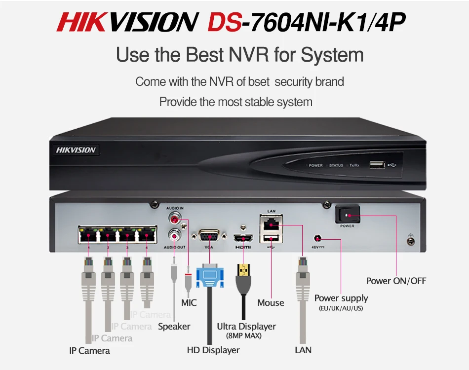 Мы используем лучший бренд безопасности (Hikvision) NVR в этом наборе, чтобы убедиться, что он работает хорошо.