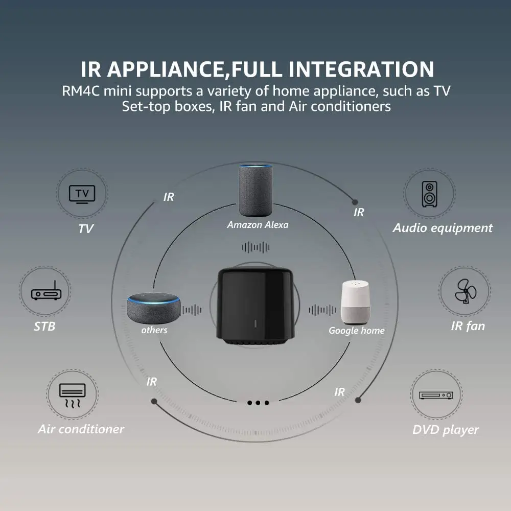 1. BestCon является суббрендом компании Broadlink, используйте новое название приложения Broadlink. 2. Обратите внимание, что google закрыл телевизоров contaction и других развлекательных устройств, rm4c mini может управлять только кондиционером через него BroadLink BestCon RM4C мини Управляйте своими ИК-приборами из любой точки мира --- Совместимость с Alexa и Google Home для голосового контроля вашего кондиционера --- Способ доставки: AliExpress Стандартная доставка ---- быстрее и безопаснее! --- Если возникнут какие-либо проблемы при использовании с google home, пожалуйста, свяжитесь с нами напрямую, наши специалисты помогут вам. --- Пожалуйста, используйте 2,4 ГГц Wi-Fi. Принимаем Оптовые и прямые поставки. 【Голосовое управление 】Hogar inteligente совместим с Alexa и Google Home для голосового управления вашим телевизором, кондиционером. Заводская стандартная посылка с кабелем, а не вилкой. Вы можете использовать разъем для сотового телефона или купить его в нашем магазине, чтобы отправить его вам вместе. Пожалуйста, обратите внимание на то, что почтовый индекс начинается с 35(las palmas ), 38(Santa Cruz de Tenerife), 51(Ceuta), 52(Melilla) не находится на складе в Испании, Пожалуйста, разместите заказ из Китая.