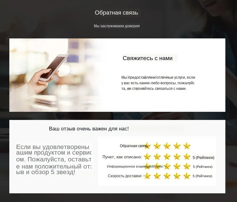 Если у вас есть какие-либо проблемы с нашими товарами или услугами, пожалуйста, свяжитесь с нами, прежде чем оставить негативные отзывы. Мы сделаем все возможное