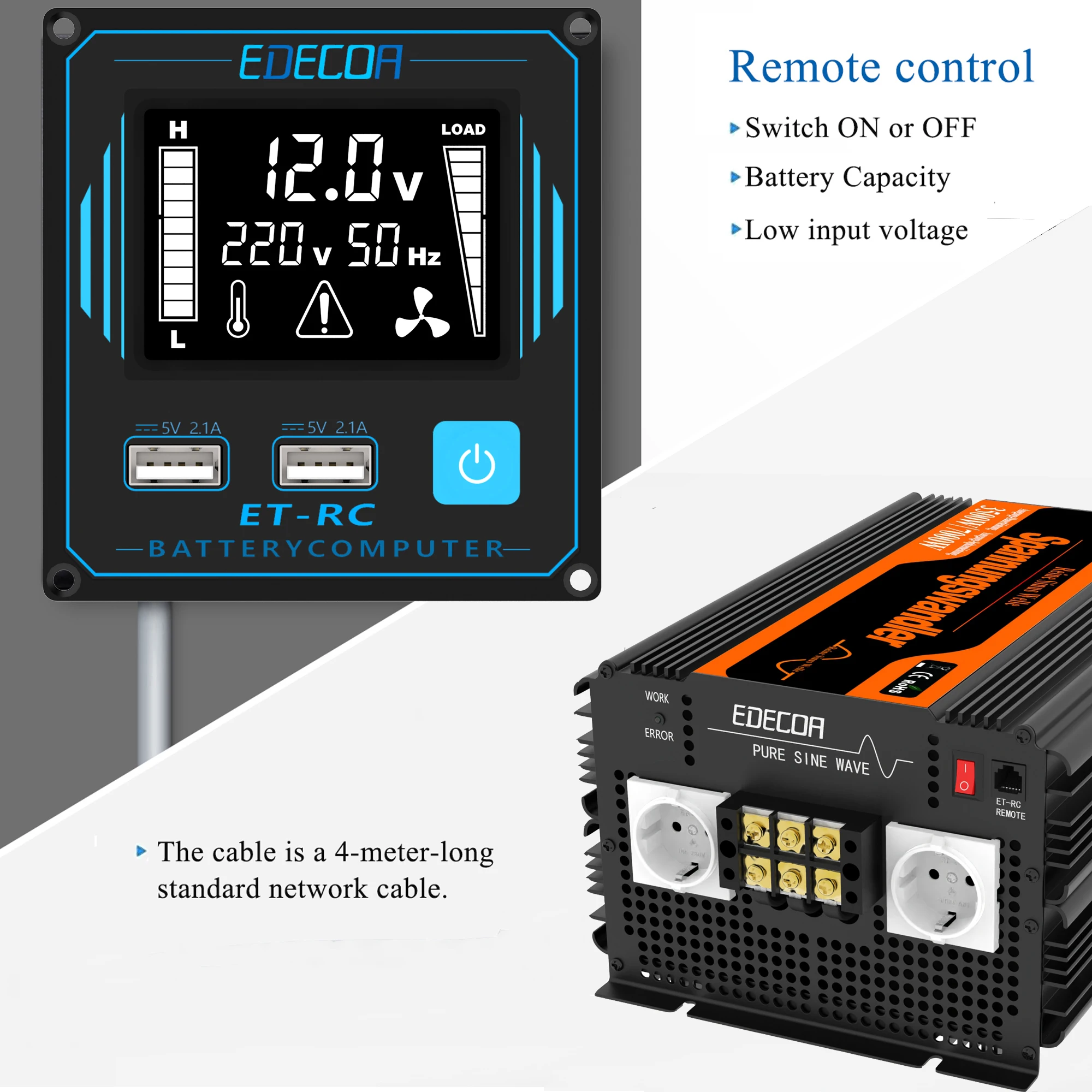 Новая версия 3,0 Многофункциональный пульт дистанционного управления, ЖК-дисплей, который показывает емкость батареи, давление нагрузки, Входное и выходное напряжение и ток, выходную частоту, температуру инвертора и код сигнализации. Два usb-порта 5 в 2,1 а для мобильных телефонов и планшетов.